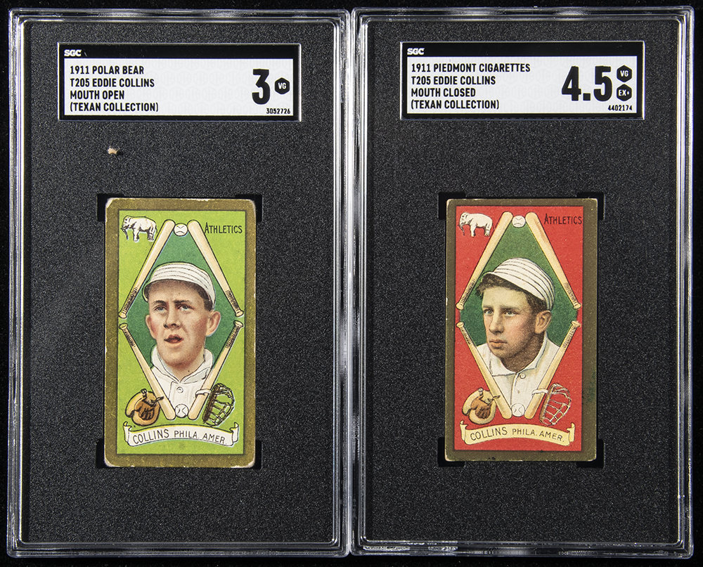 1911 T205 Gold Borders Eddie Collins (2). Includes "mouth open" with Polar Bear back (SGC 3 VG) and "mouth closed" (SGC 4.5 VG EX+): SGC 3 VG and 4.5 VG EX+
