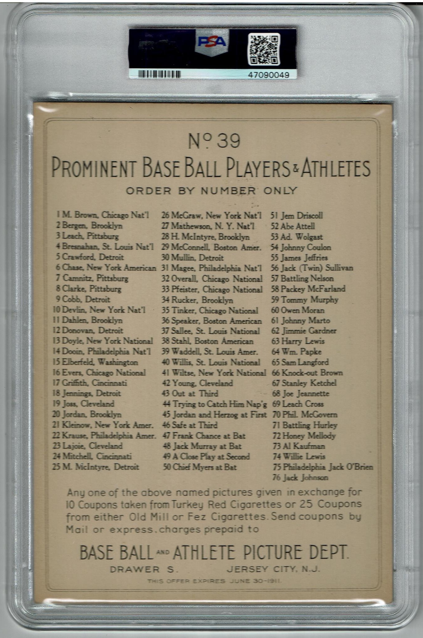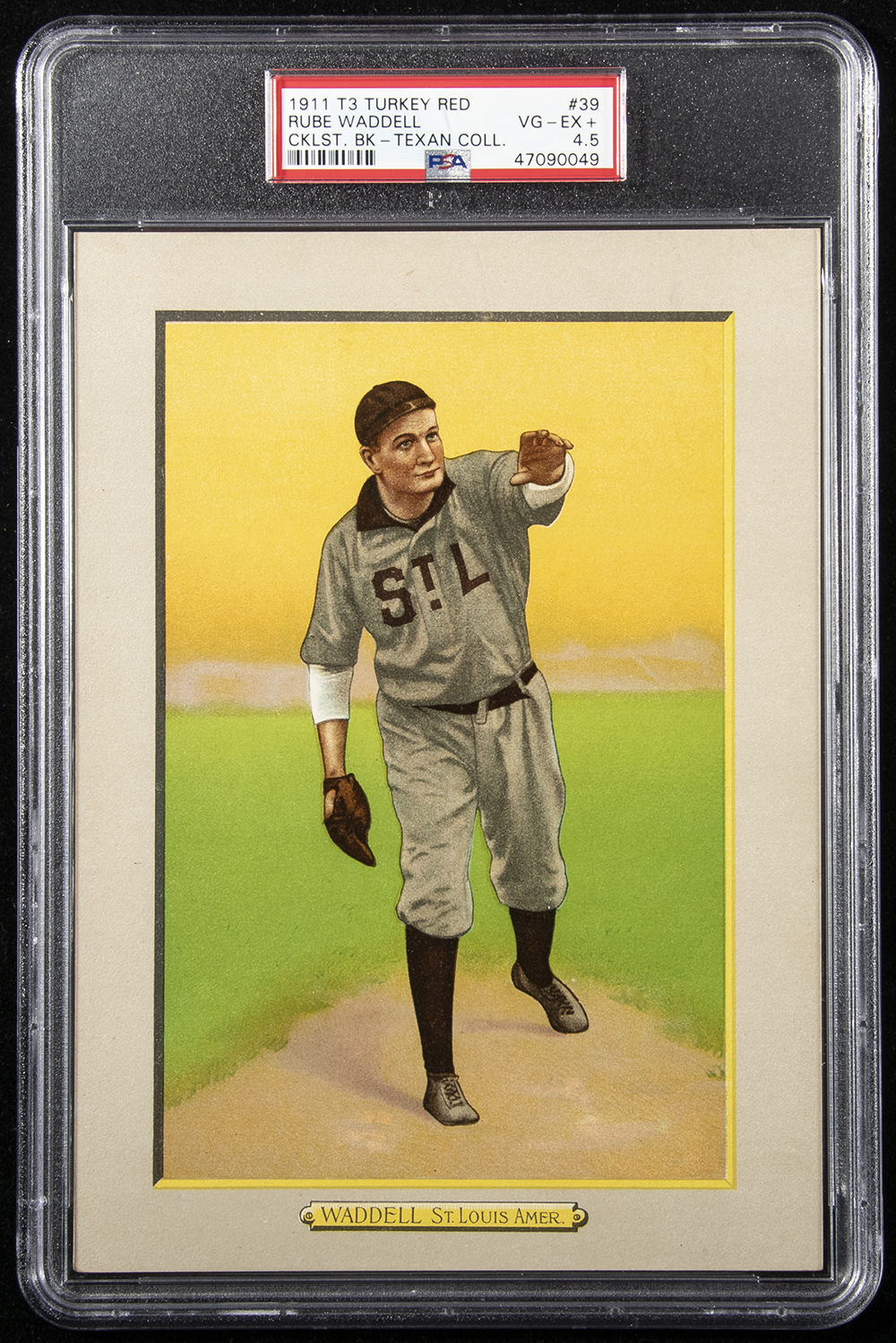 1911 T3 Turkey Red Rube Waddell (Checklist back). Desirable card with crisp color shows only the slightest touch of light wear: PSA VG-EX+ 4.5