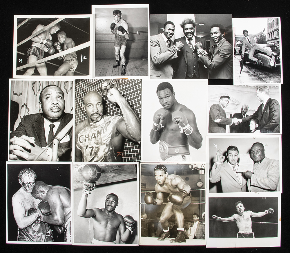 Description:Lot of (120) boxing related photographs c.1930-80s. Very substantive archive with mixture of fight images and street clothes photos with majority related to African American fighters. Subjects include Larry Holmes, Sonny Liston ,Doug Jones, Carmen Basilio, Jack Jackson, Floyd Patterson w/John Kennedy, Sugar Ray Robinson, Rocky Marciano/Joe Walcott, Jake LaMotta, and Holmes/Leonard. Sizes range from 3"x5" to 8"x10" with various news service or photographer stamps on back. Strong quality images throughout with nice breakdown value: Range GD-NM