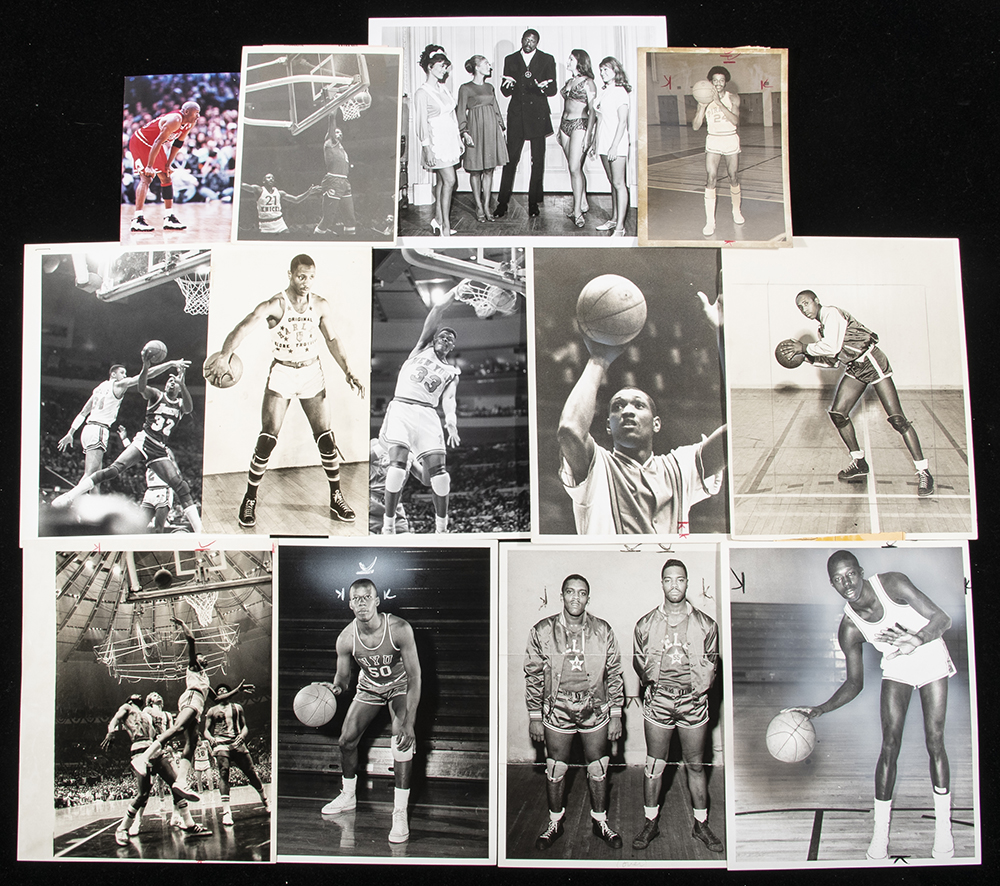 Description:Lot of (61) basketball photographs c.1930-90s. Excellent selection of a mixture of collegiate, semi pro, and professional players comprised largely with relation to African American players. Subjects include Michael Jordan, Magic Johnson. Walt Frazier, Bill Russell, Ted Strong, and T.Thacker. Sizes range from 3"x5" to 8"x10" with various news service or photographer stampings on back: Range VG-NM