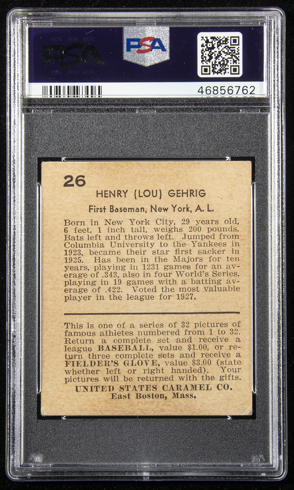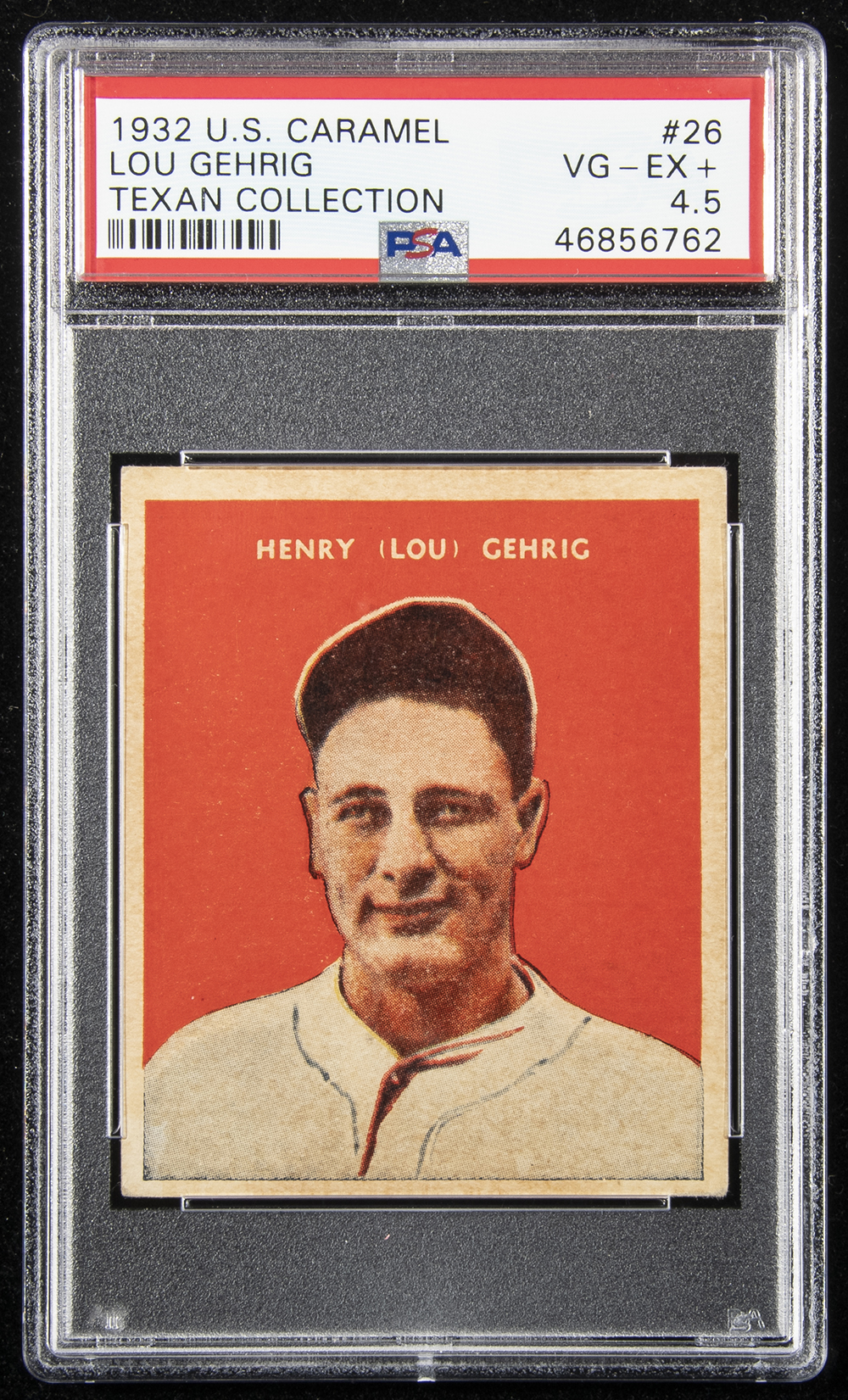 1932 U.S. Caramel #26 Lou Gehrig. Bold color and just a hint of light corner wear: PSA VG-EX+ 4.5