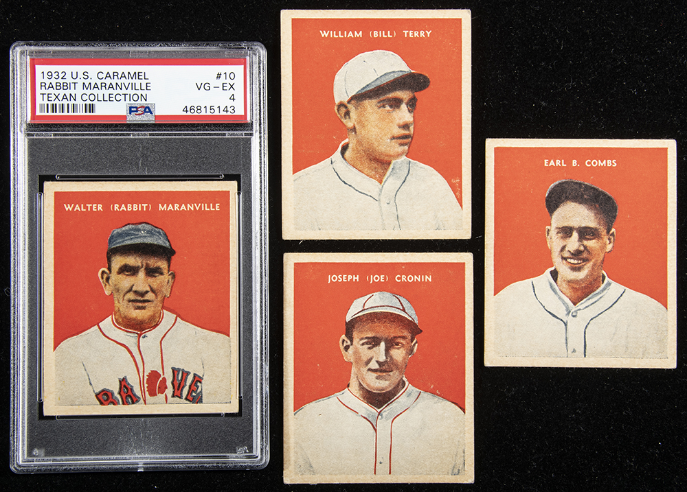 1932 U.S. Caramel lot of (4) Hall of Famers. Includes #4 Terry (VG), 5 Combs (VG/EX), 7 Cronin (VG), and 10 Maranville (PSA VG-EX 4): VG-VG/EX
