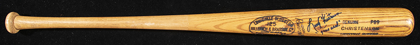 Description:Larry Christenson autographed professional model baseball bat, c.1977-79. 36" Louisville Slugger P89 CHRISTENSON model bat with his #38 written on the knob. Christenson signed the bat in blue marker and added "game used" inscription. Signature rates 8/9 out of 10. The bat shows excellent use with ball marks, grain swelling, and rack marks. Includes certificate of provenance from Larry Christenson: EX