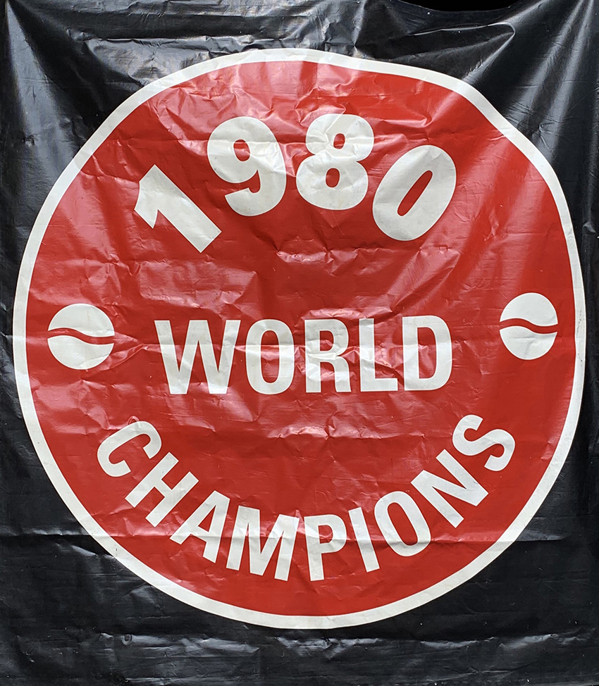 Description:Significant Veterans Stadium Philadelphia Phillies 1980 World Champions banner. Original 90"x102" vinyl banner removed from Veterans Stadium following the 2003 season. The banner was an iconic fixture as displayed on the outfield wall of Veterans Stadium in commemoration of the Phillies only World Championship at the stadium. Moderate general surface wearing with impressive display qualities. MLB Authenticated serial #MT00288101 hologram sticker is affixed and includes certificate of provenance from Larry Christenson: EX-EX/MT