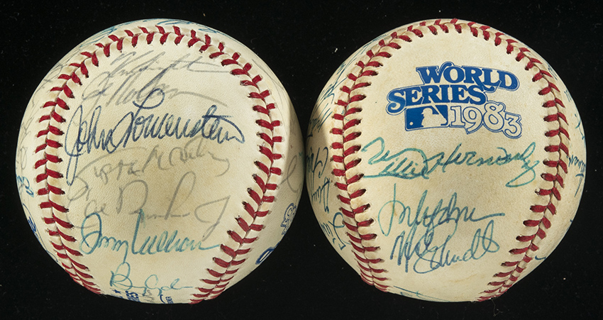 Description:1983 NL Champion Philadelphia Phillies and World Champion Baltimore Orioles team signed baseballs. Includes official 1983 World Series ball signed by (22) members of the NL champion Phillies: Paul Owens, Mike Schmidt, Steve Carlton, Joe Morgan, Tony Perez, Pete Rose, John Denny, Garry Maddox, Gary Matthews, Al Holland, Charles Hudson, Bo Diaz, Joe Lefebvre, Willie Hernandez, Kevin Gross, Ron Reed, Von Hayes, and others; and official 1983 World Series ball signed by (32) members of the world champion Orioles: Joe Altobelli, Cal Ripken Jr, Eddie Murray, Jim Palmer, Scott McGregor, Rick Dempsey, Mike Boddicker, Tippy Martinez, Storm Davis, Mike Flanagan, Ken Singleton, Gary Roenicke, Sammy Stewart, John Lowenstein, Al Bumbry, Dan Ford, Todd Cruz, and others. Signatures rate 6/7 to 10 (avg 8) out of 10. Both balls have areas of light to moderate toning. Includes certificate of provenance from Larry Christenson: EX-EX/MT