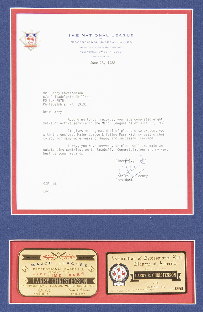 Description:Larry Christenson's MLB lifetime pass with related items. Approx. 12.5"x18" framed display containing 1982 typed letter signed "Chub" by Charles Feeney stating that Christenson is being presented with his lifetime pass after completing eight years of service. The pass is matted below the letter, along with his APBPA life membership card. Includes certificate of provenance from Larry Christenson: NM