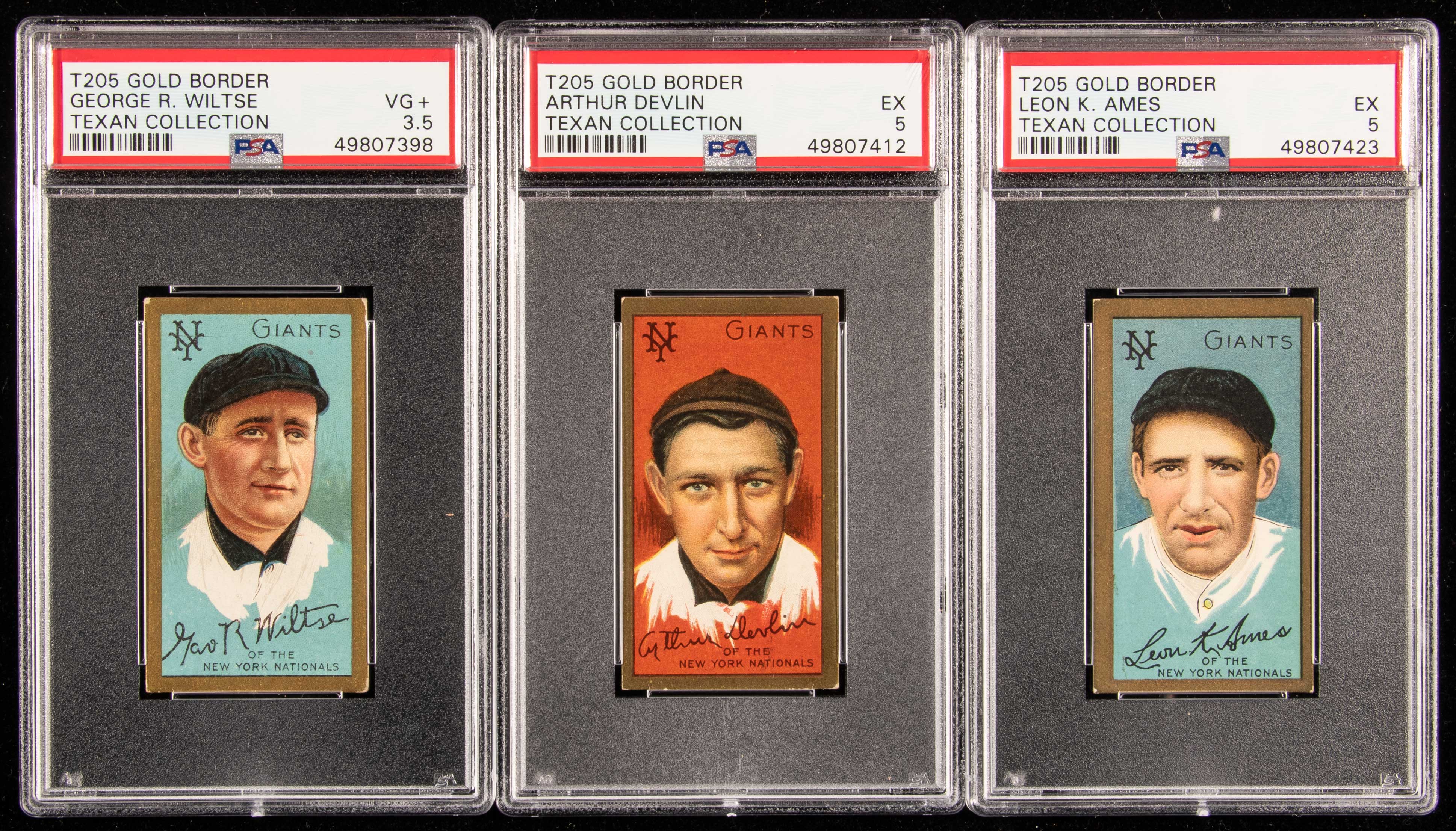 Lot of (3) 1911 T205 Gold Border New York Giants. Includes Red Ames (PSA EX 5); Art Devlin (PSA EX 5); and George Wiltse (Hassan back, only right ear shows) (PSA VG+ 3.5): PSA 3.5 VG+ and PSA EX 5