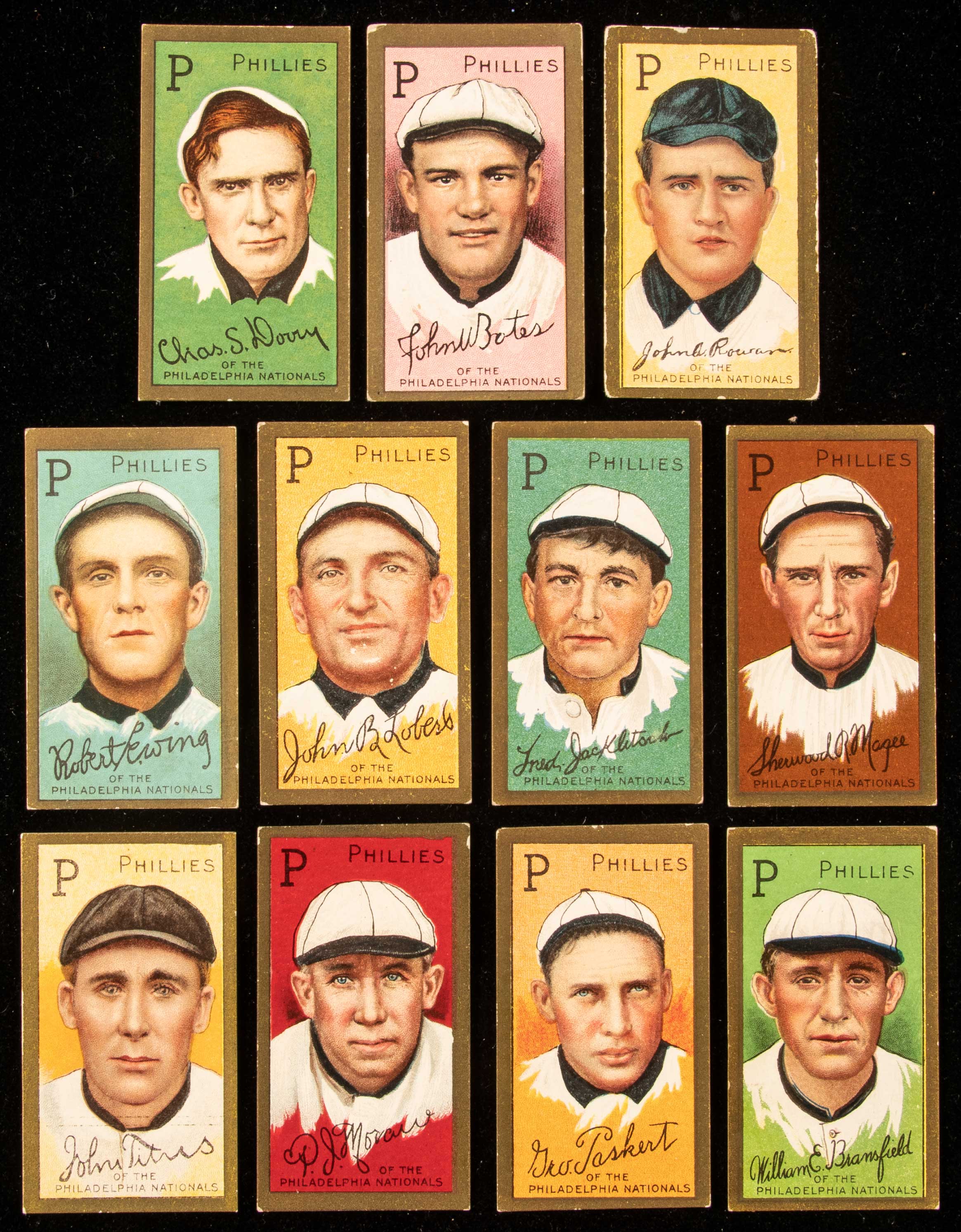 Lot of (11) 1911 T205 Gold Border Philadelphia Phillies incl. John Rowan shortprint. Includes Bates (VG, back misaligned), Bransfield (FR/GD), Dooin (VG/EX-EX), Ewing (VG/EX-EX), Jacklitsch (EX), Lobert (VG), Magee (VG-VG/EX), Moran (Sovereign back, no stray line, VG/EX), Rowan (Hassan back, GD/VG-VG), Paskert (VG/EX), and Titus (EX). Varying degrees/types of wear throughout: FR/GD-EX