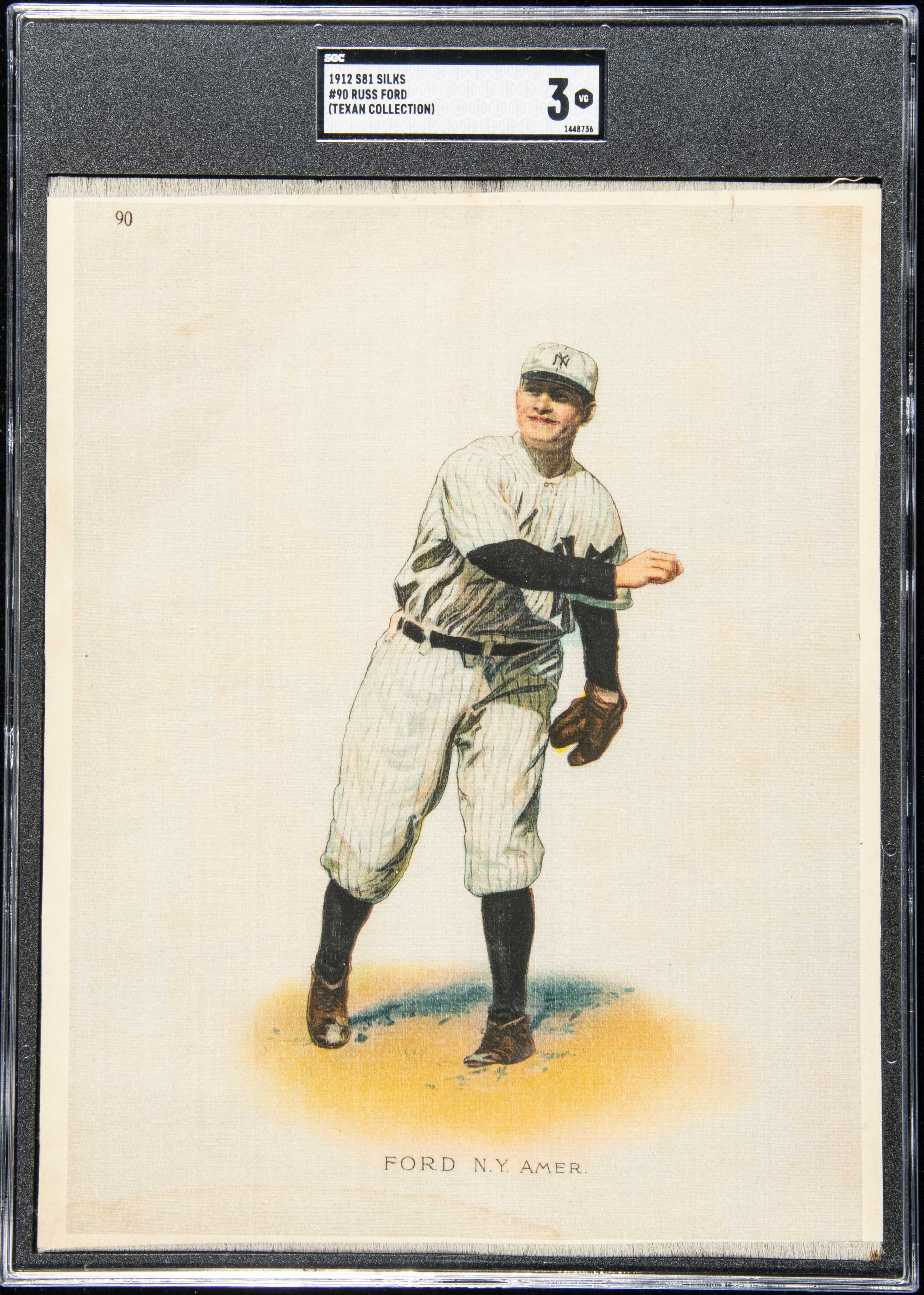 1912 S81 Large Silk Premium #90 Russ Ford. Hint of light toning and some mild general wear light wear which mostly takes the form of wrinkles as are commonly found with this issue. Very minor stain along the lower edge: SGC 3 VG