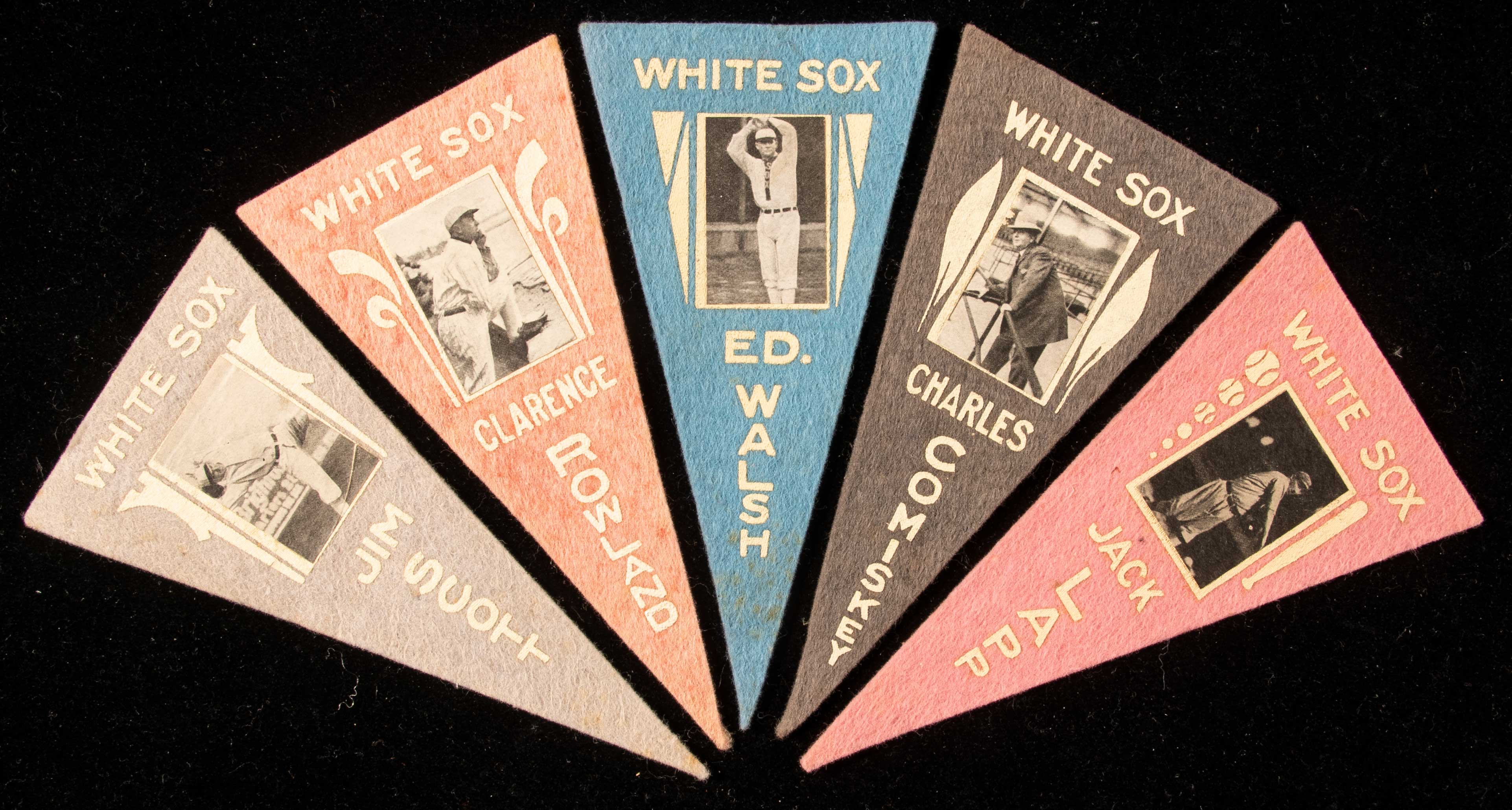 Description:Lot of (5) 1916 BF2 Ferguson Bakery Chicago White Sox felt pennants. Includes Charles Comiskey, Ed Walsh, Jack Lapp, Clarence Rowland, and Jim Scott. Very nice condition throughout with just the slightest hint of wear and there is some minor spotting to the Walsh: VG/EX-EX/MT