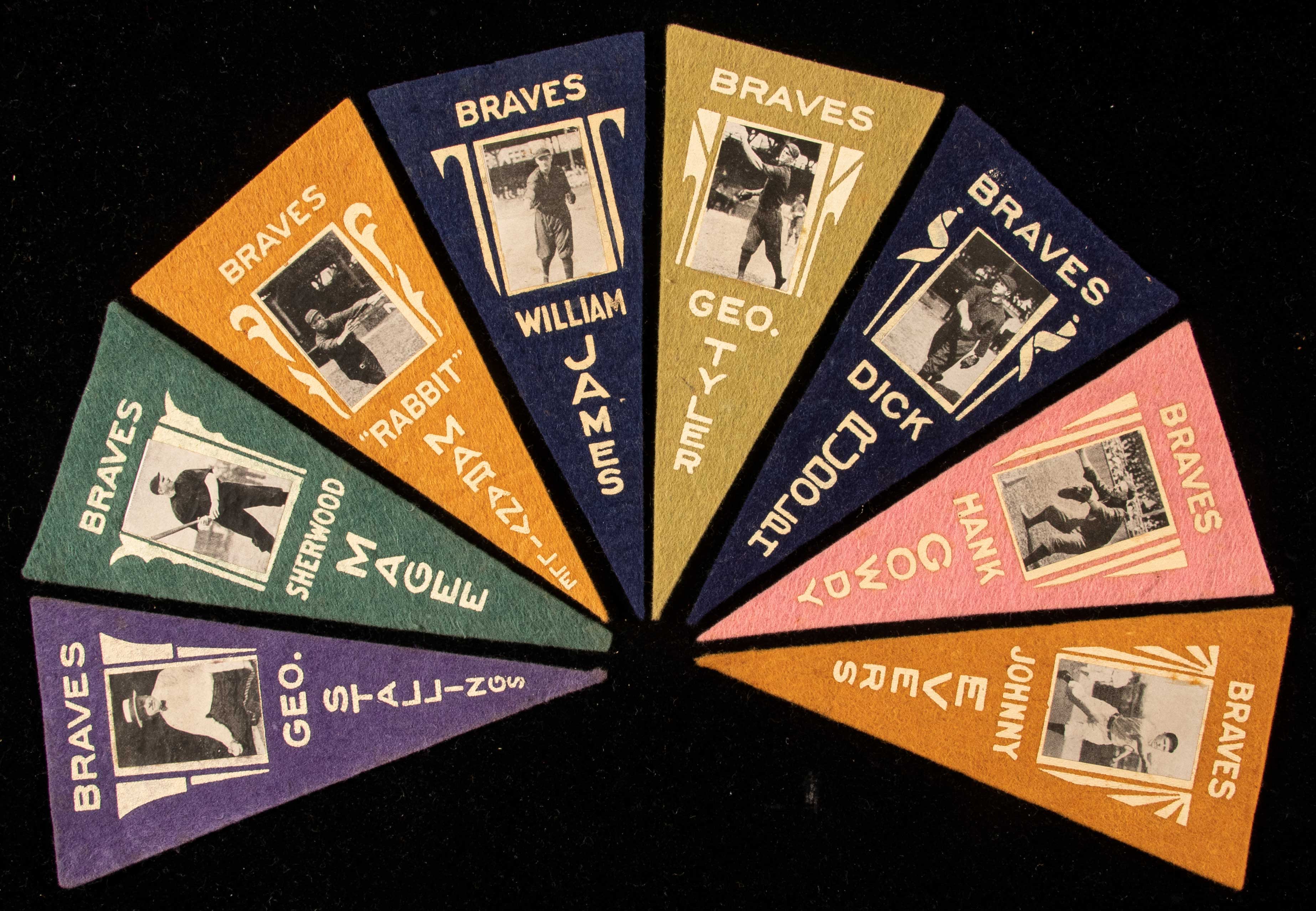 Description:Lot of (8) 1916 BF2 Ferguson Bakery Boston Braves felt pennants. Includes Johnny Evers, Rabbit Maranville, Sherry Magee, Bill James, Dick Rudolph, George Stallings, and George Tyler. Light to mild scattered wear and the Magee is missing one pointed tip: VG-EX/MT
