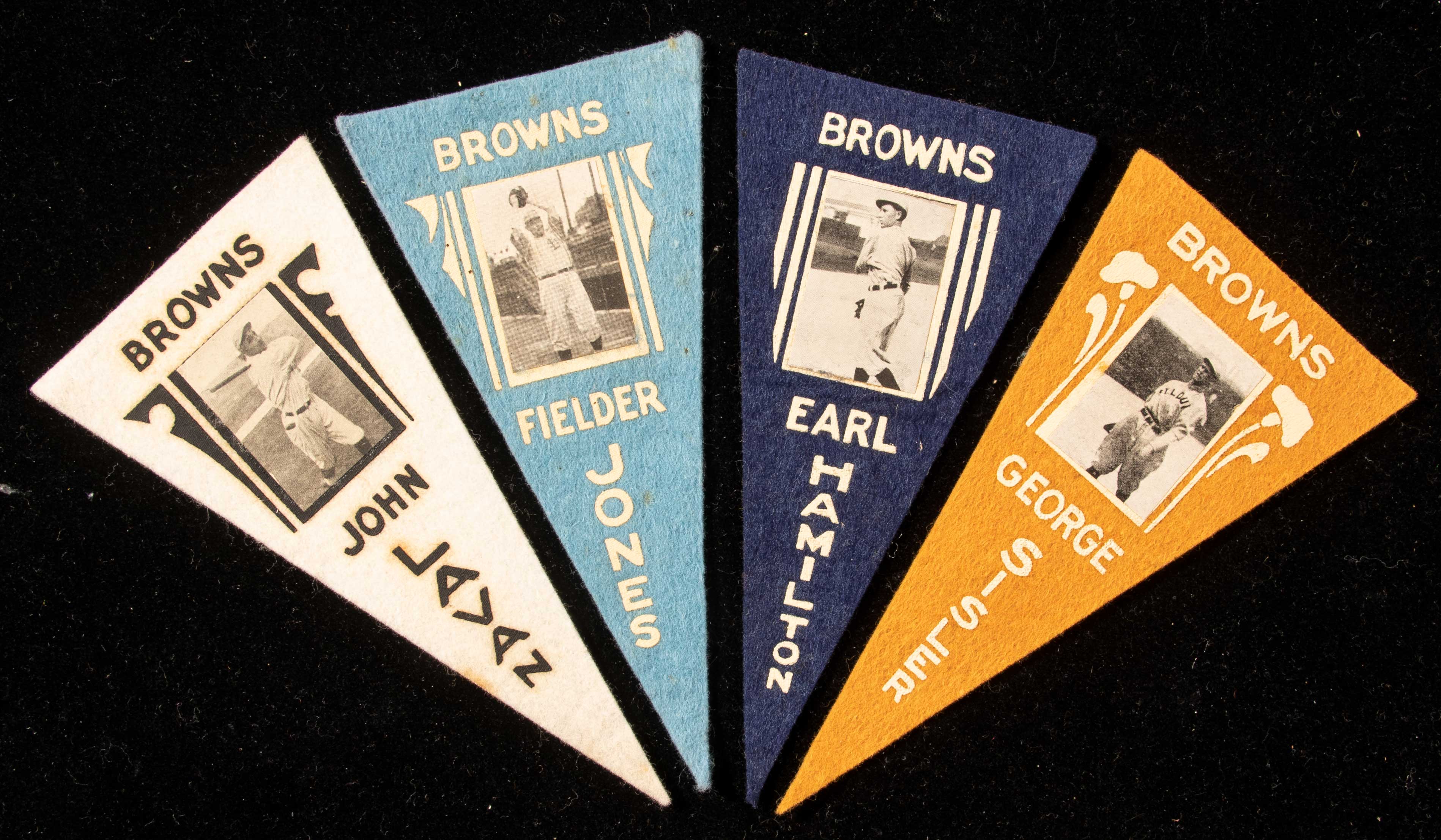 Lot of (4) 1916 BF2 Ferguson Bakery St. Louis Browns felt pennants. Includes George Sisler, John Lavan, Fielder Jones, and Earl Hamilton. Light scattered wear is a touch more accentuated on Jones: EX-EX/MT