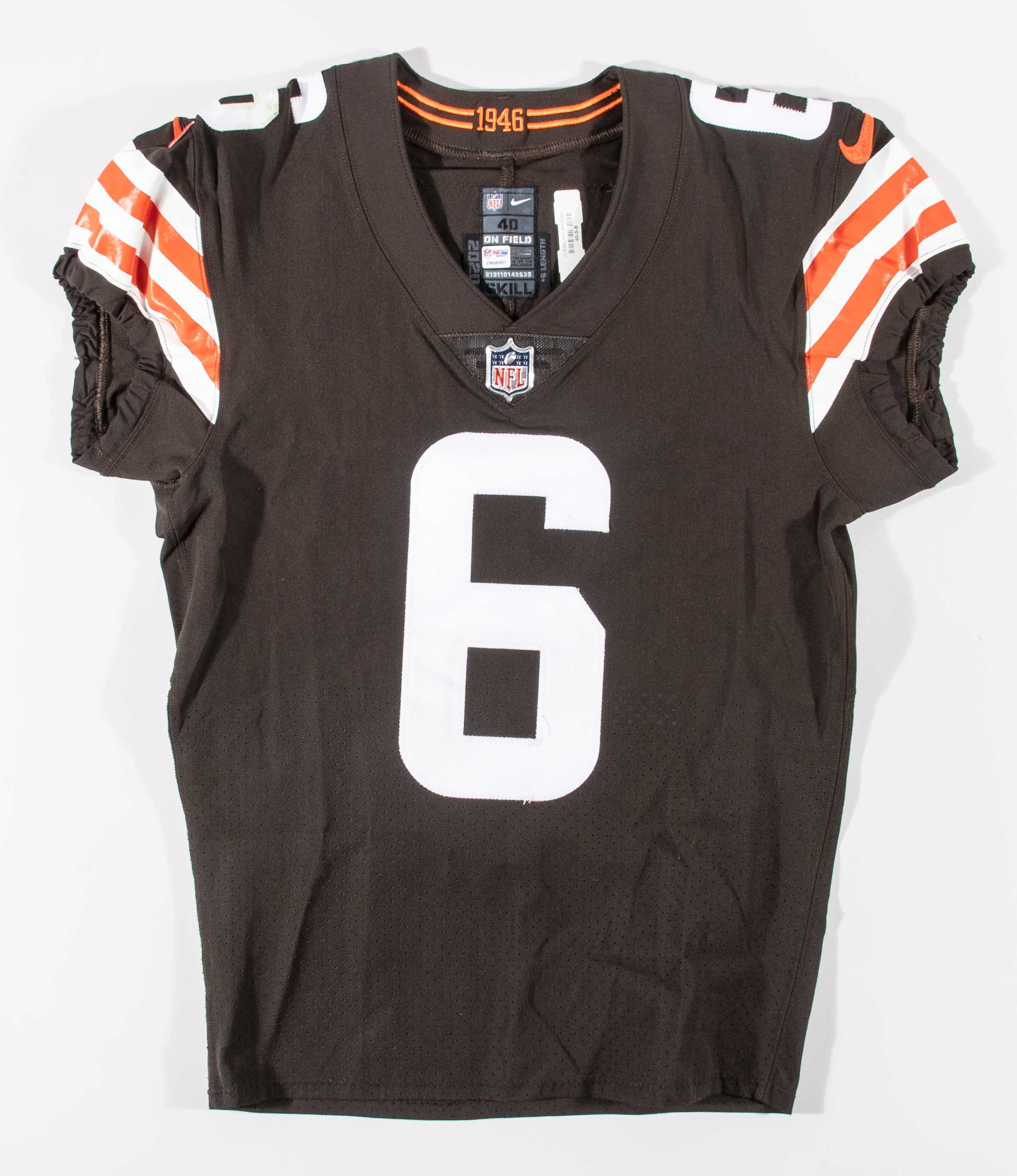 Description:October 11, 2020 Baker Mayfield game worn Cleveland Browns jersey. Nike "On Field" size 40 Browns #6 Baker Mayfield jersey worn during their "Crucial Catch" cancer awareness game against the Colts. Mayfield threw 2-TD passes in the game. The jersey shows excellent use with light staining on the front, and a grass stain on the right shoulder. Includes NFL Auction COA from PSA/DNA with matching serial #ed sticker on the jersey: EX