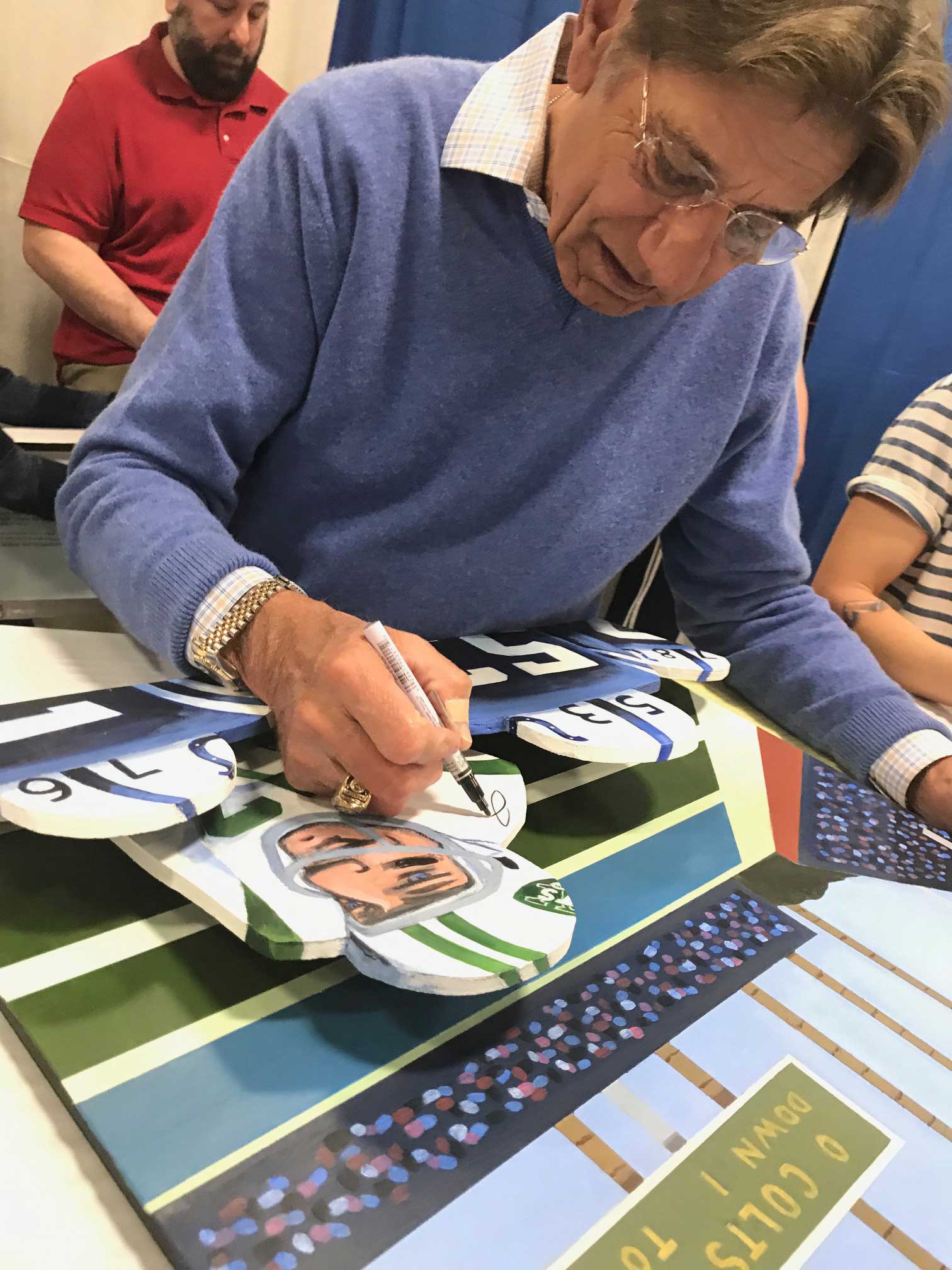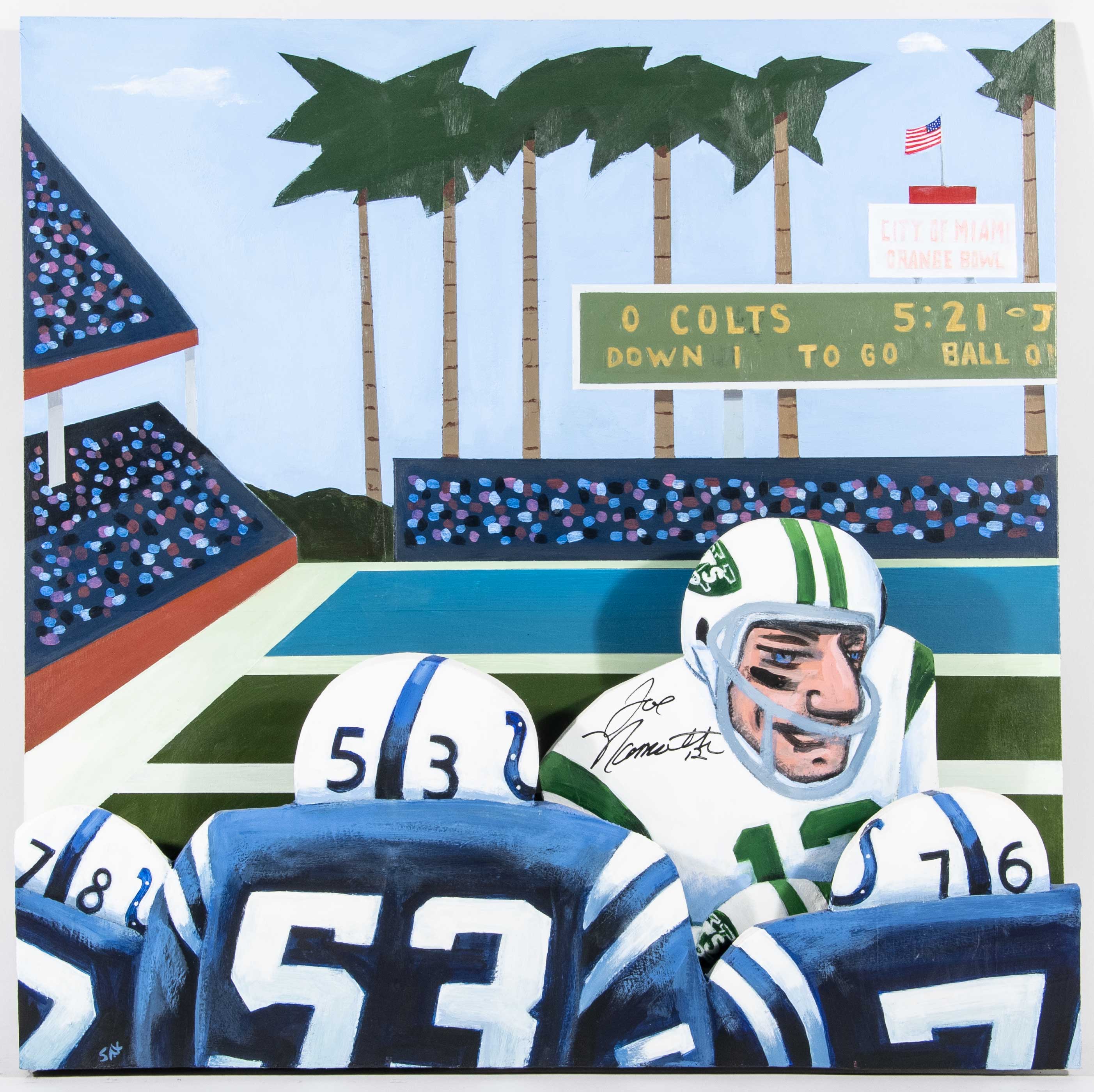 Description:Joe Namath autographed original artwork by Steve Sax. Approx. 24"x24" caricature style "Super Bowl III" painted artwork on plywood has been signed by Namath in black marker. Signature rates 9 out of 10. Also signed "SAX" on the back by the artist, Steve Sax (well known within the sports field for his modern folk-art inspired works). Includes JSA auction LOA: NM overall