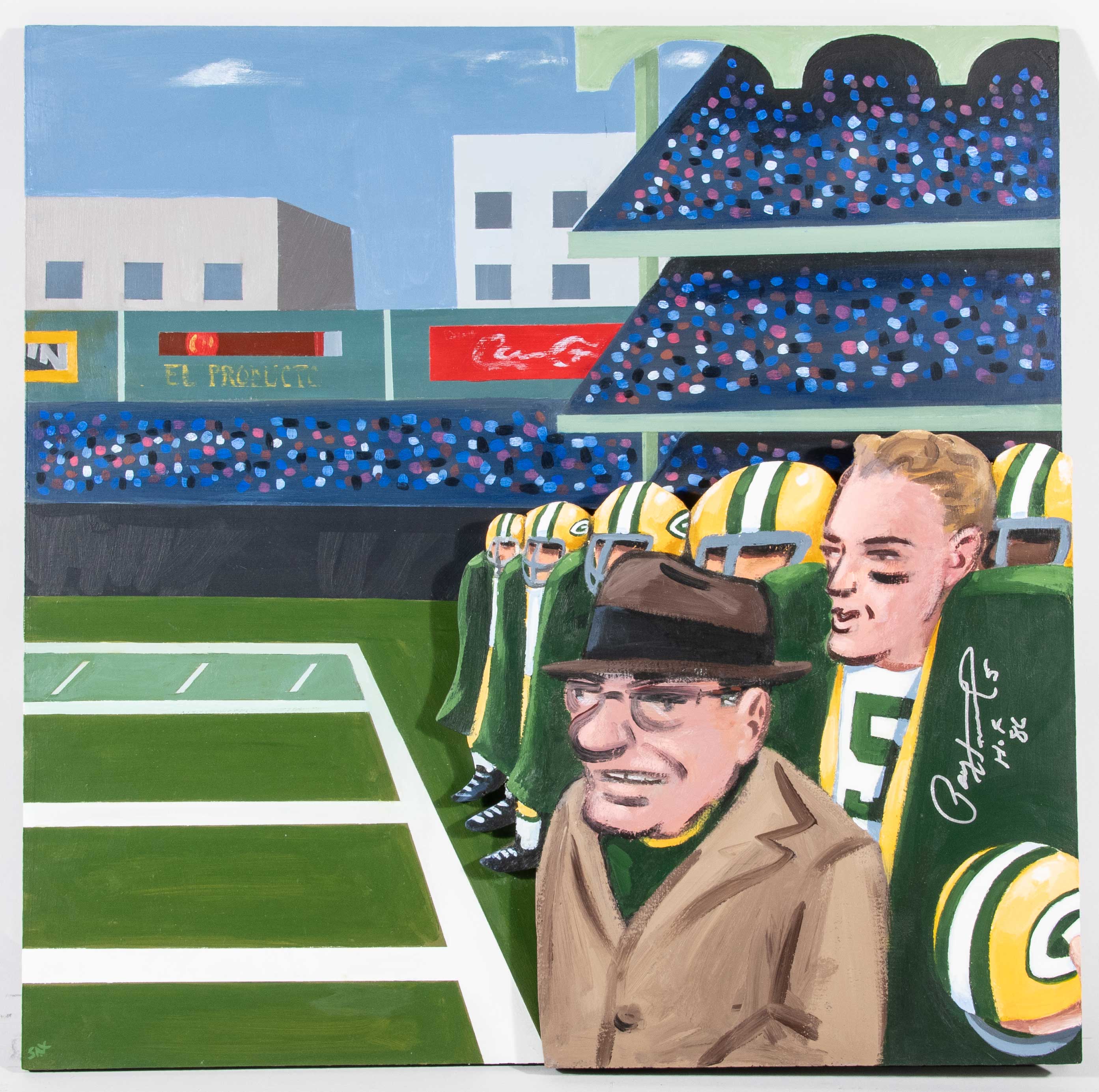Description:Paul Hornung autographed original artwork by Steve Sax. Approx. 24"x24" caricature style "Packers 1962" painted artwork on plywood has been signed by Hornung in silver marker with "HOF 86" inscription. Signature rates 8/9 out of 10. Also signed "SAX" on the back by the artist, Steve Sax (well known within the sports field for his modern folk-art inspired works). Includes JSA auction LOA: NM overall