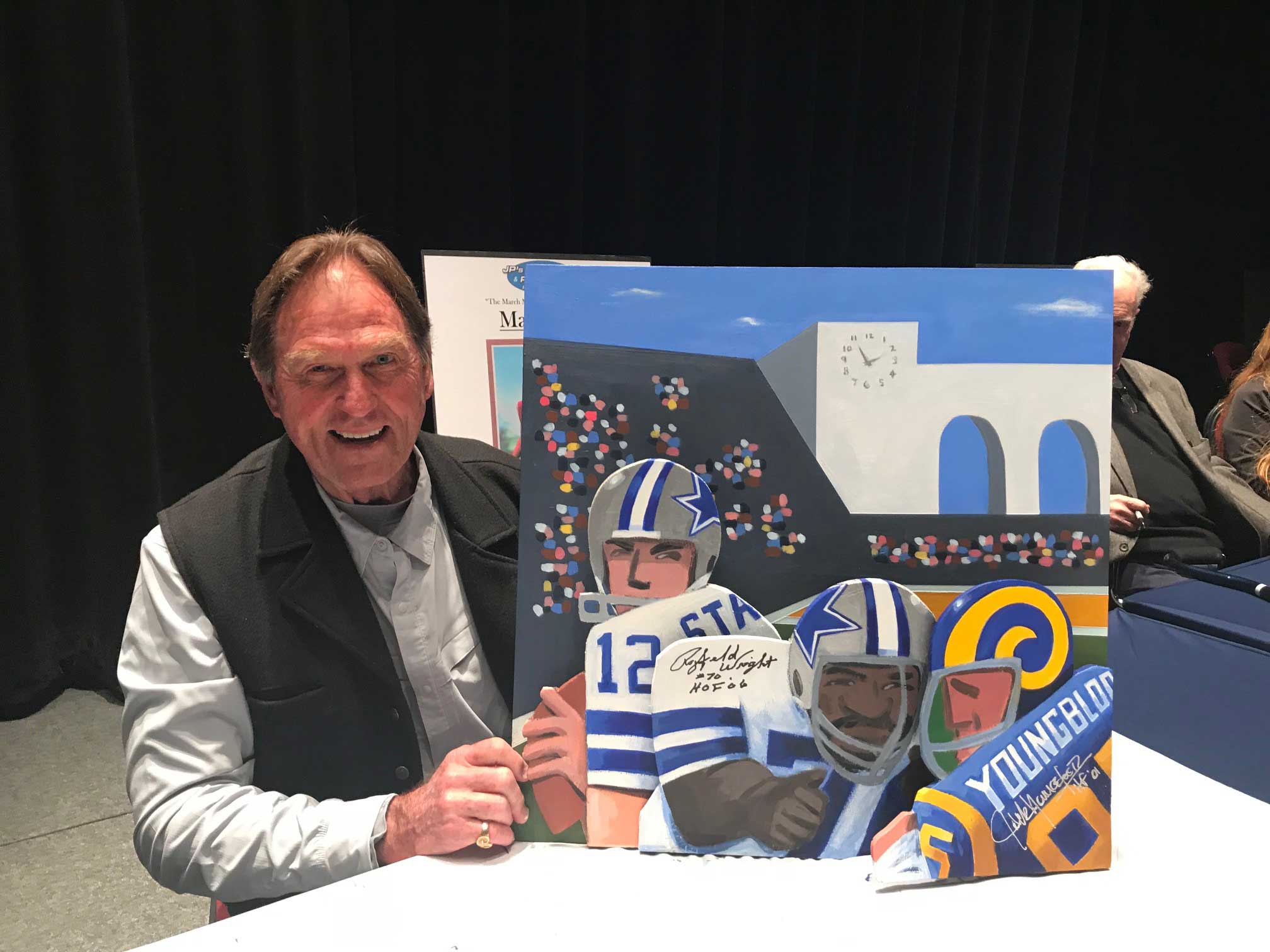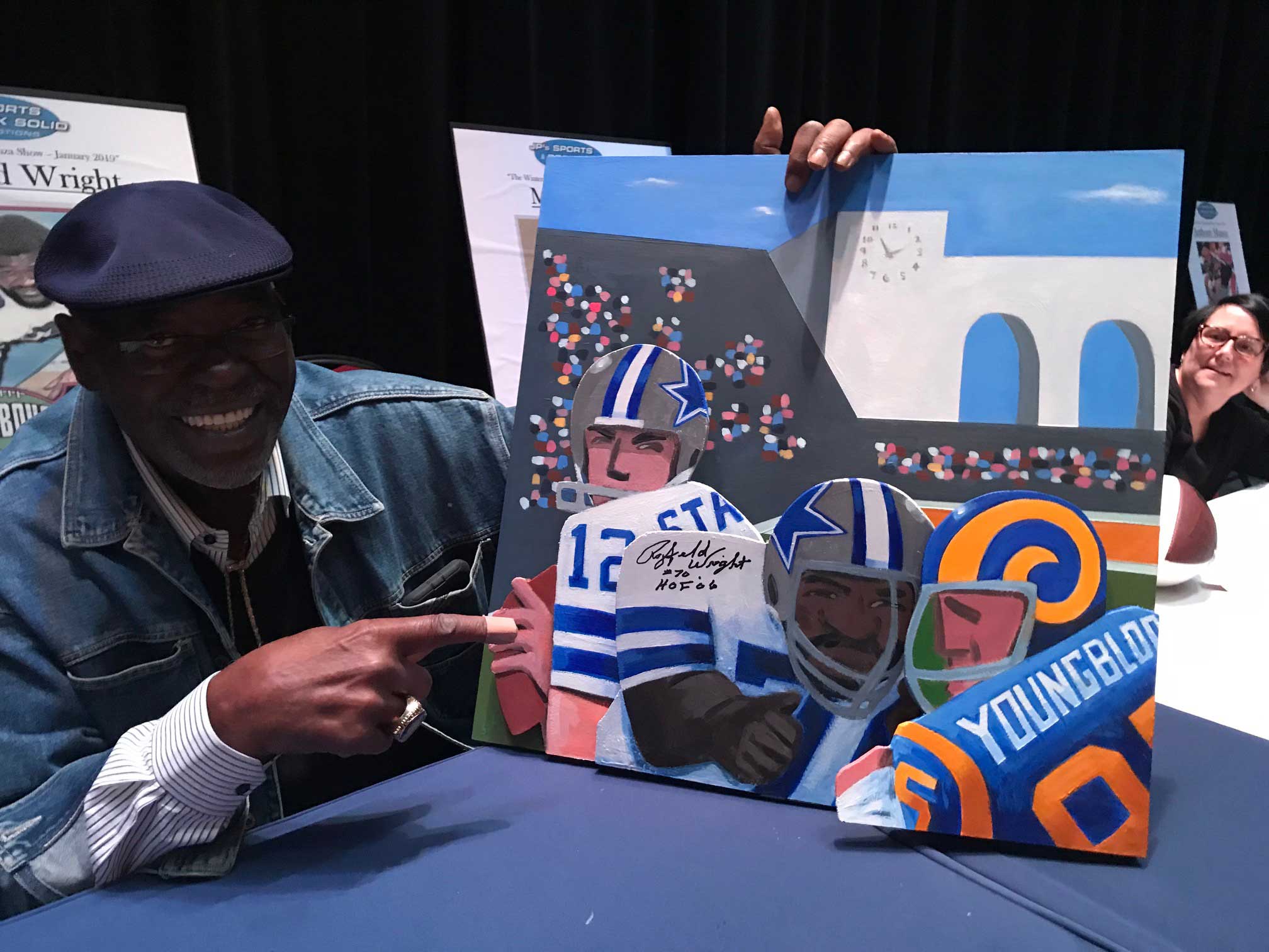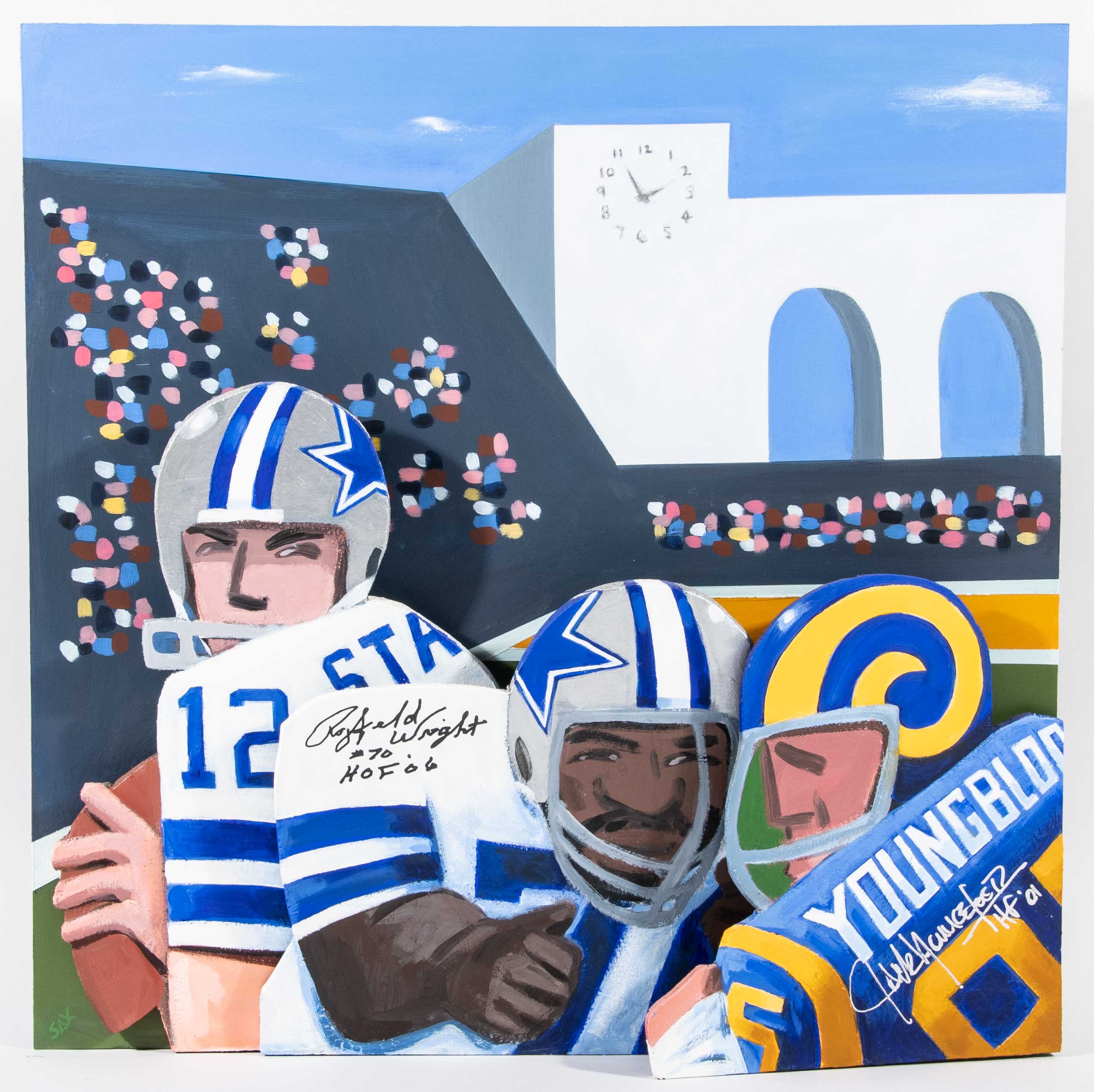 Description:Jack Youngblood and Rayfield Wright autographed original artwork by Steve Sax. Approx. 24"x24" caricature style "Third And Six" painted artwork on plywood has been signed by Youngblood in silver marker with "HOF 01" inscription and by Wright in black marker with "HOF 06" inscription. Signatures rate 9 to 10 out of 10. Also signed "SAX" on the back by the artist, Steve Sax (well known within the sports field for his modern folk-art inspired works). Includes JSA auction LOA: NM overall