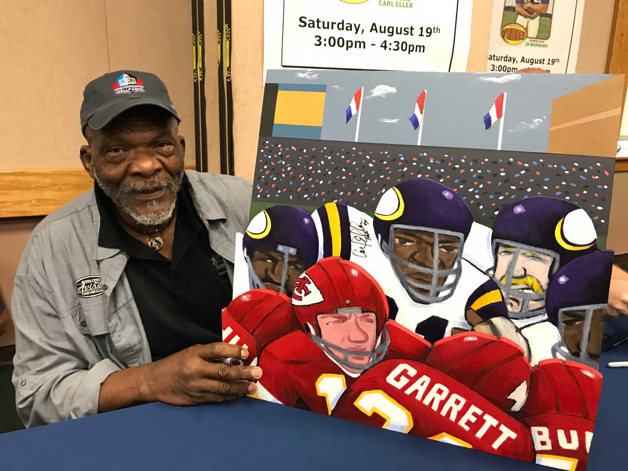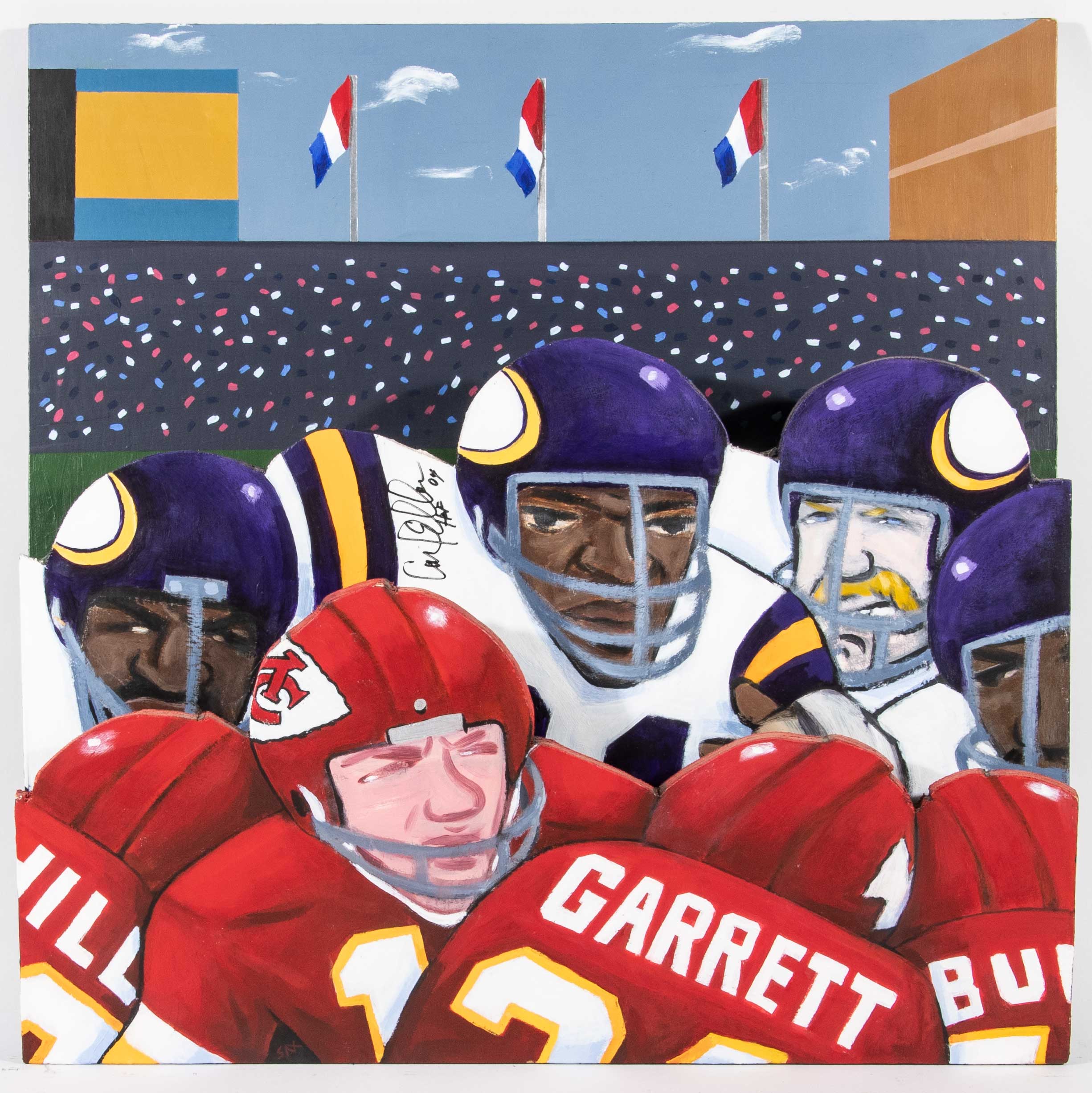 Description:Carl Eller autographed original artwork by Steve Sax. Approx. 24"x24" caricature style "Super Bowl IV" painted artwork on plywood has been signed by Eller in black marker with "HOF 04" inscription. Signature rates 8 out of 10. Also signed "SAX" on the back by the artist, Steve Sax (well known within the sports field for his modern folk-art inspired works). Includes JSA auction LOA: NM overall