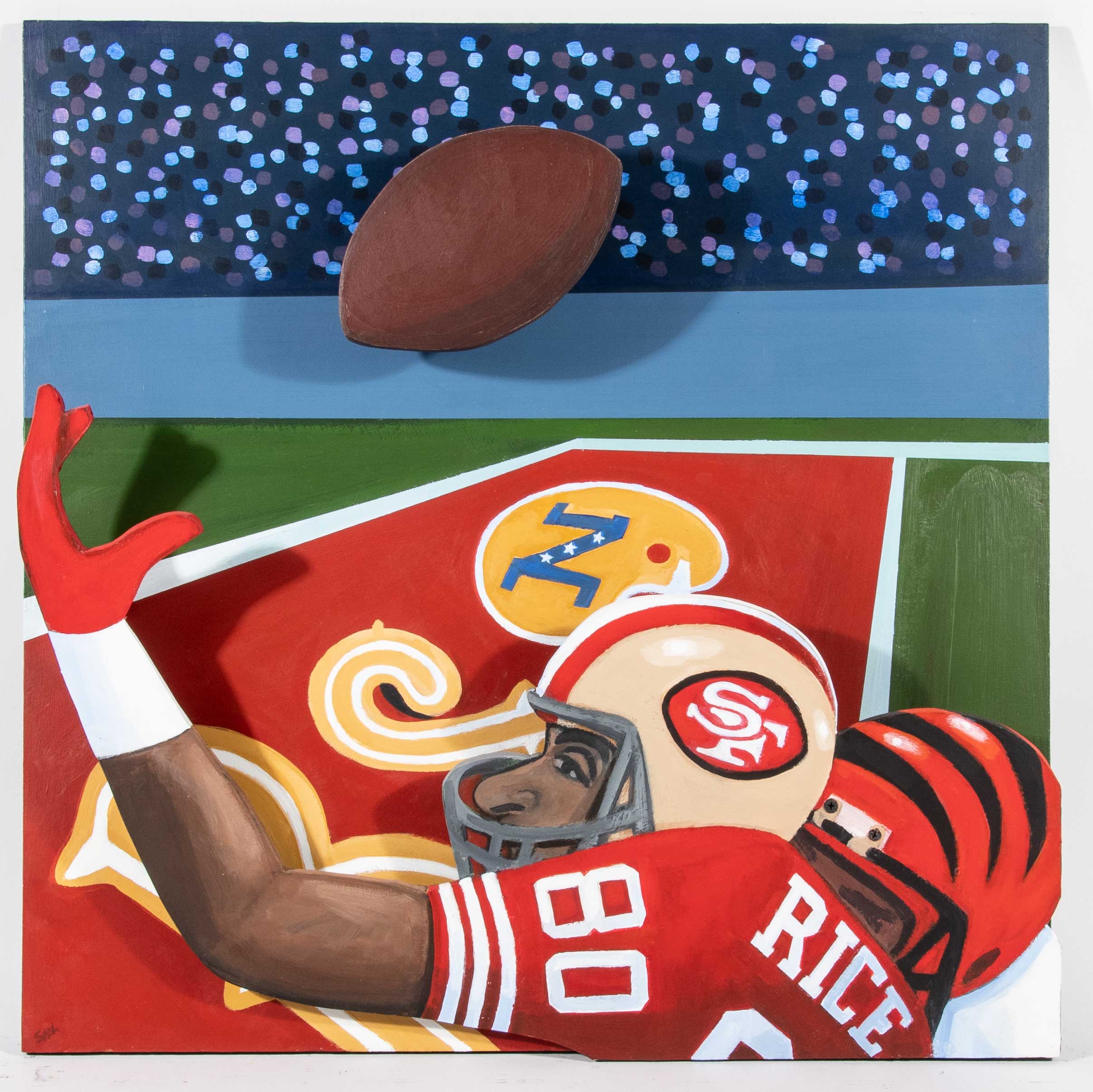 Description:Jerry Rice original artwork signed by artist Steve Sax. Approx. 24"x24" caricature style "RICE" painted artwork on plywood has been signed "SAX" at the bottom left corner, and again signed on the back along with the title of the work. Sax is well known within the sports field for his modern folk-art inspired works: NM overall