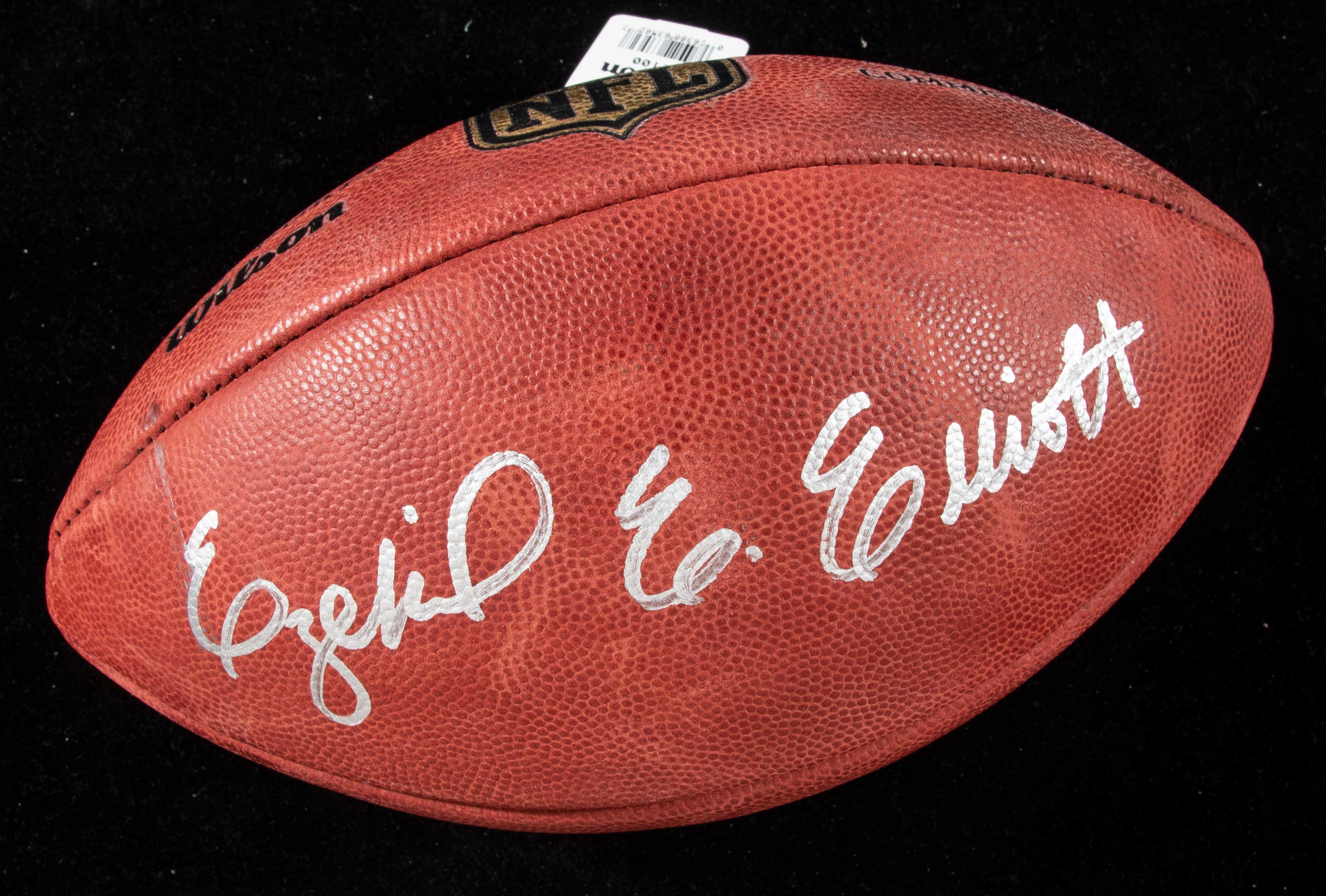 Ezekiel Elliott autographed authentic NFL football. Wilson "The Duke" NFL football signed by Elliott in silver marker. Signature rates 8/9 out of 10. Includes NFL Auction COA from PSA/DNA, with matching serial #ed sticker on the ball: NM