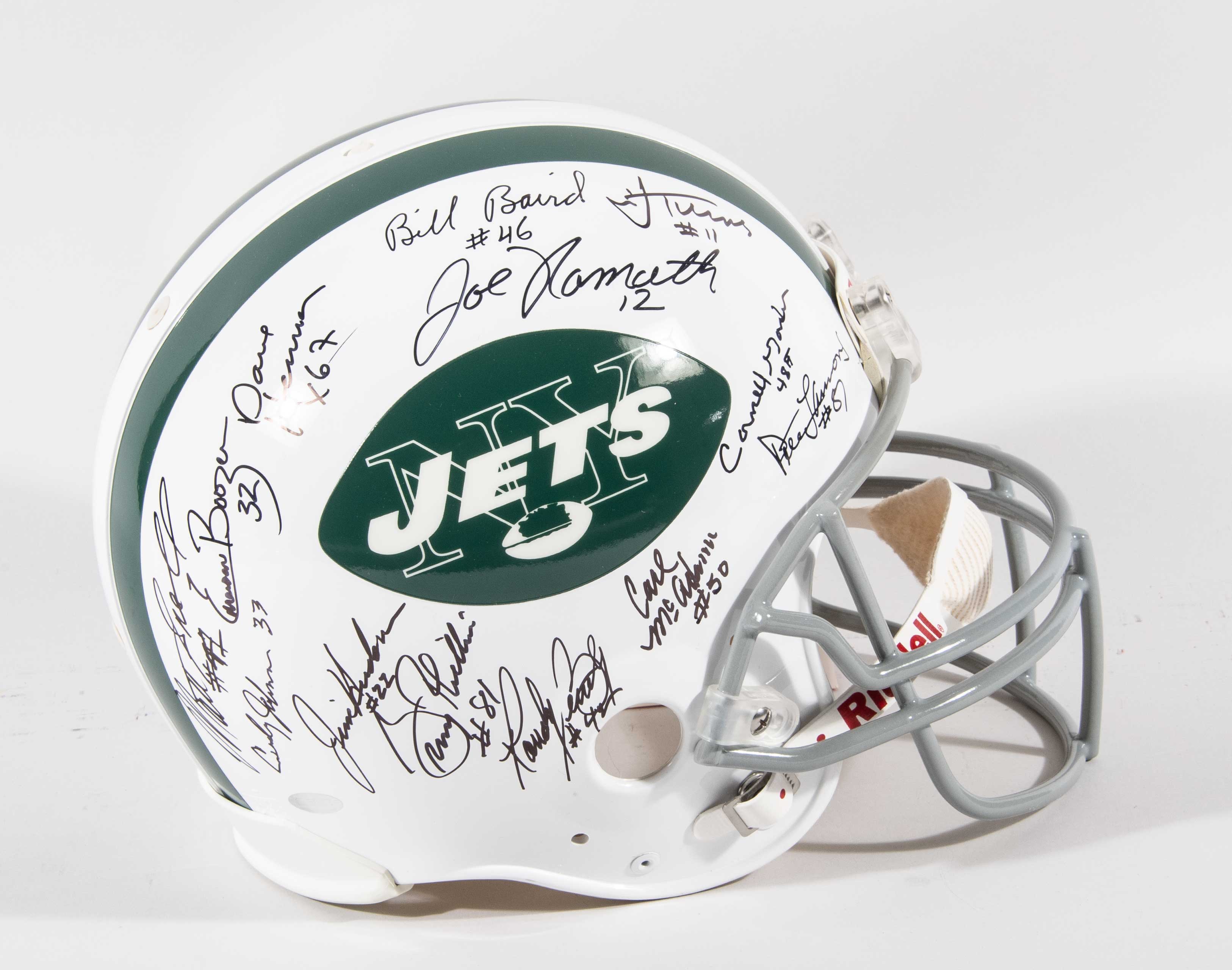 Description:1968 New York Jets team signed helmet - Super Bowl III Champions. Top of the line VSR-4 full sized helmet has been signed by (24) incl. Joe Namath, Emerson Boozer, Matt Snell, Bob Mathis, Don Maynard, Al Atkinson, and others. Marker signatures generally rate 8 to 9/10 out of 10 with a few that have a very minor flaw mentioned largely for accuracy. Includes high quality lucite display case (hint of light wear) and there is a Mounted Memories authentication hologram affixed: NM
