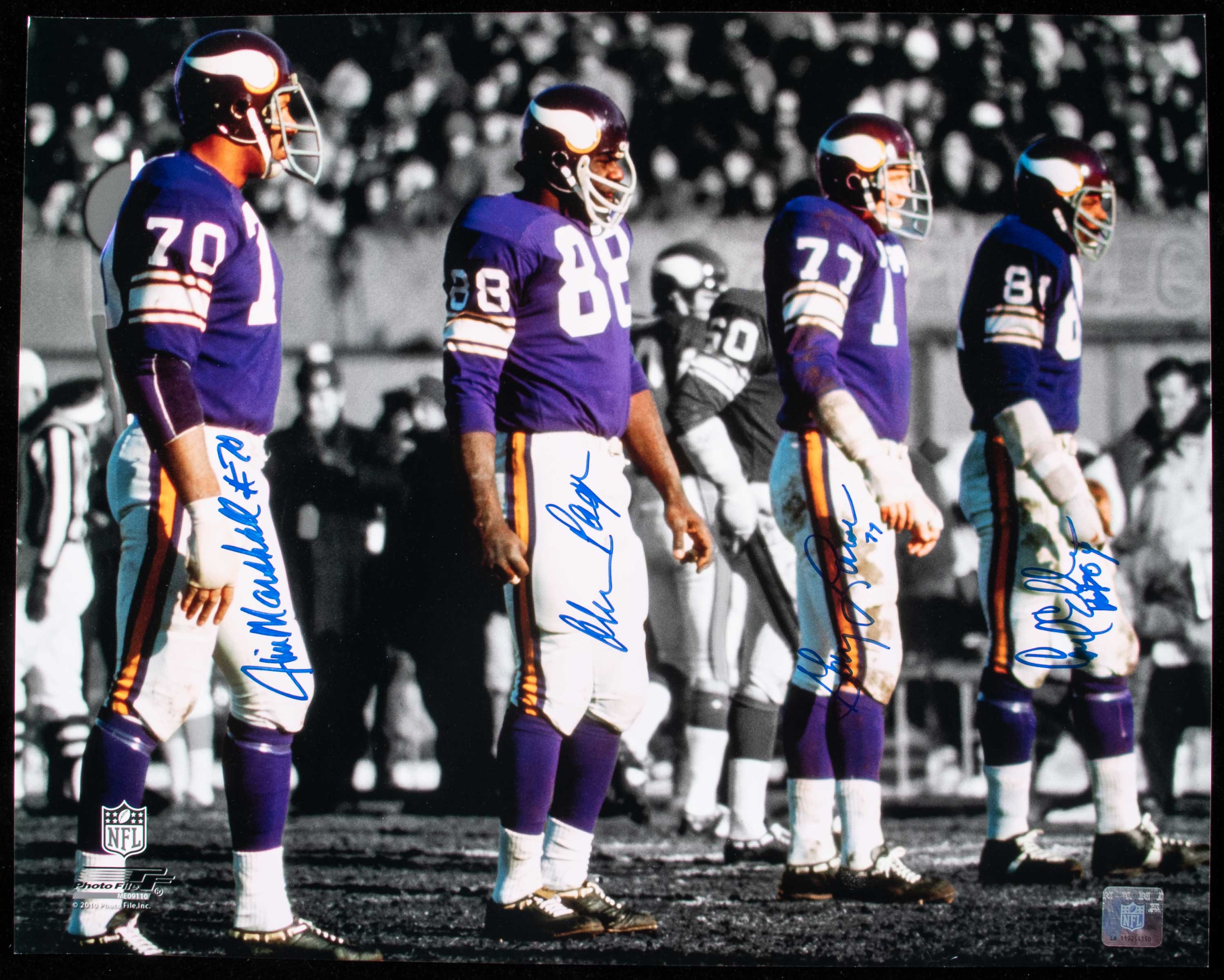 Purple People Eaters autographed 16"x20" photograph. Signed by Jim Marshall, Alan Page, Gary Larsen, and Carl Eller in marker rating 9/10 out of 10. Includes auction LOA from JSA: NM