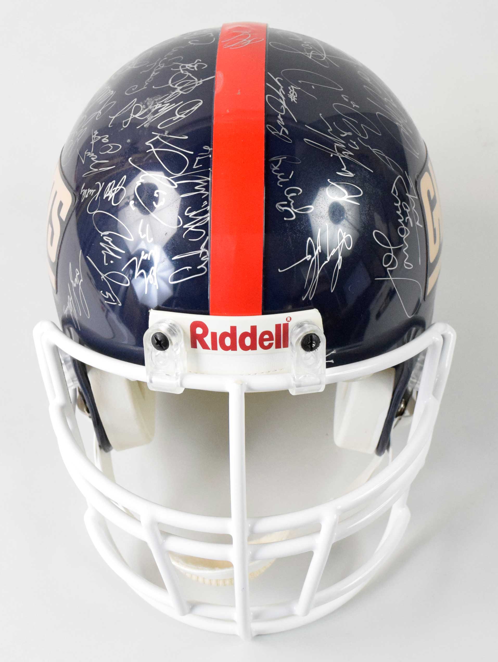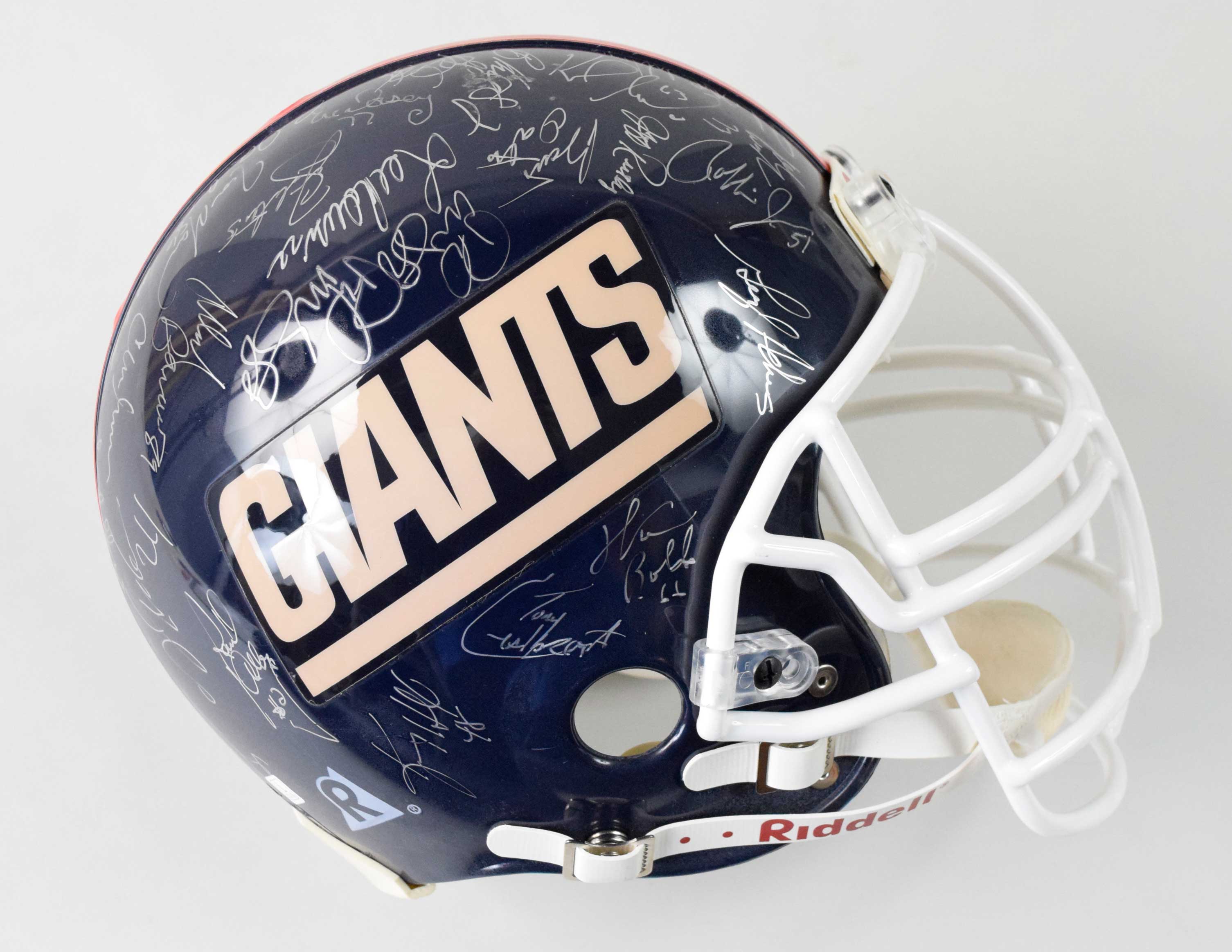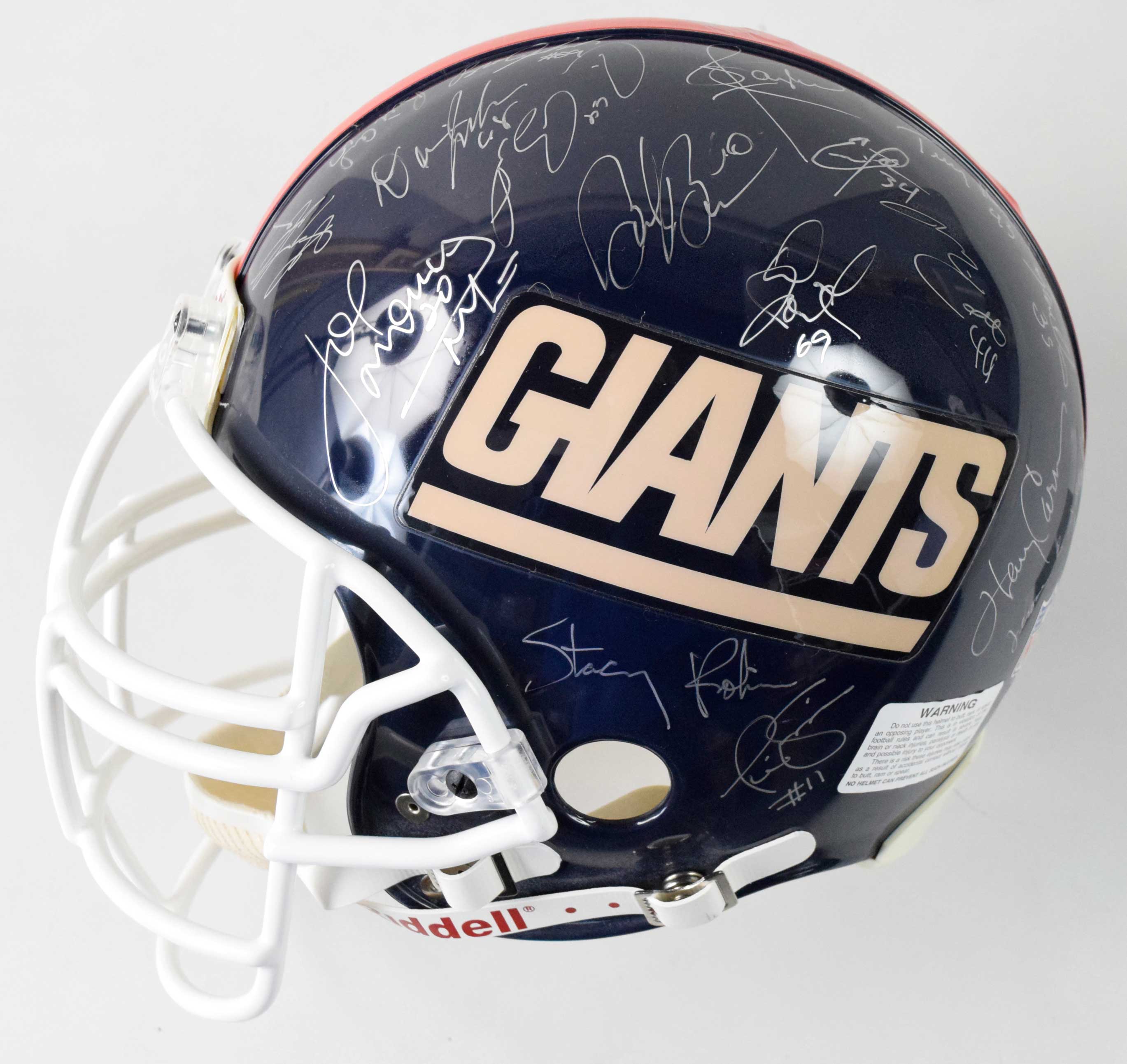 Description:1986 New York Giants team autographed helmet (Super Bowl Champions). Riddell VSR 4 Pro Line New York Giants model helmet signed by approx. (45) members of the Super Bowl Champion Giant to include L.Taylor, P.Simms, H.Carson, and C.Banks. Sigs range from 8-10 out of 10 with one small sudge to a signature on top of helmet. Very impressive example with uncommonly large number of signatures. Includes auction LOA from JSA and mirrored back display case: NM