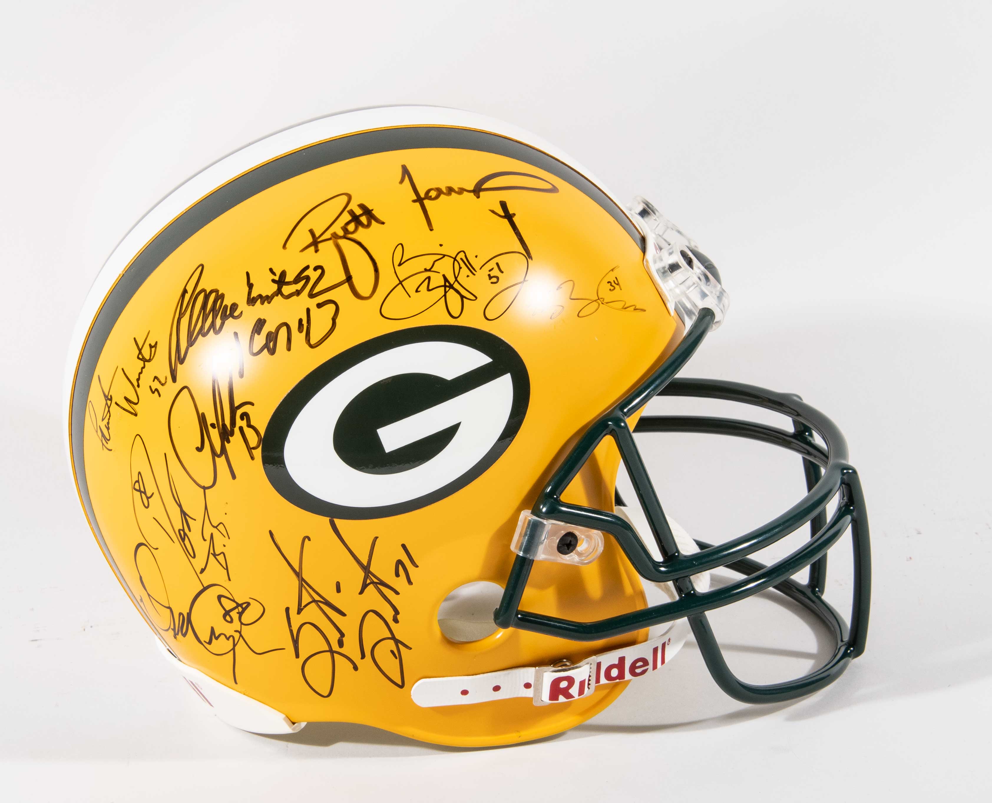 Description:1996 Green Bay Packers team signed helmet - Super Bowl XXXI Champions. Full sized replica helmet by Riddell has been signed by (16) incl. Reggie White, Brett Favre (traced/enhanced in a few areas), Mark Chmura, Dorsey Levens, Robert Brooks, LeRoy Butler, Antonio Freeman, and others. Marker signatures rate 7/8 to 9 out of 10. Includes high quality lucite display case and full LOA from JSA: NM