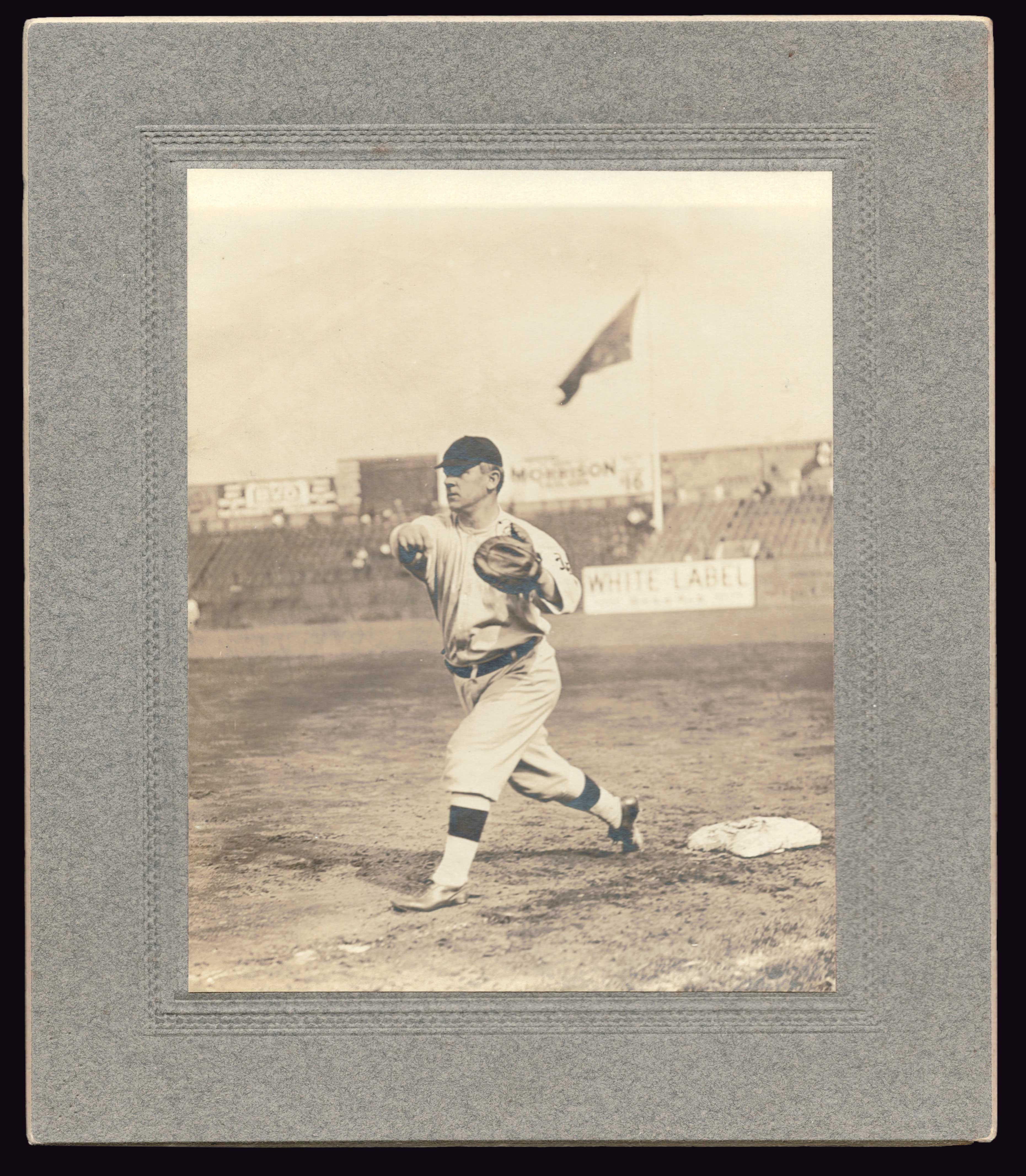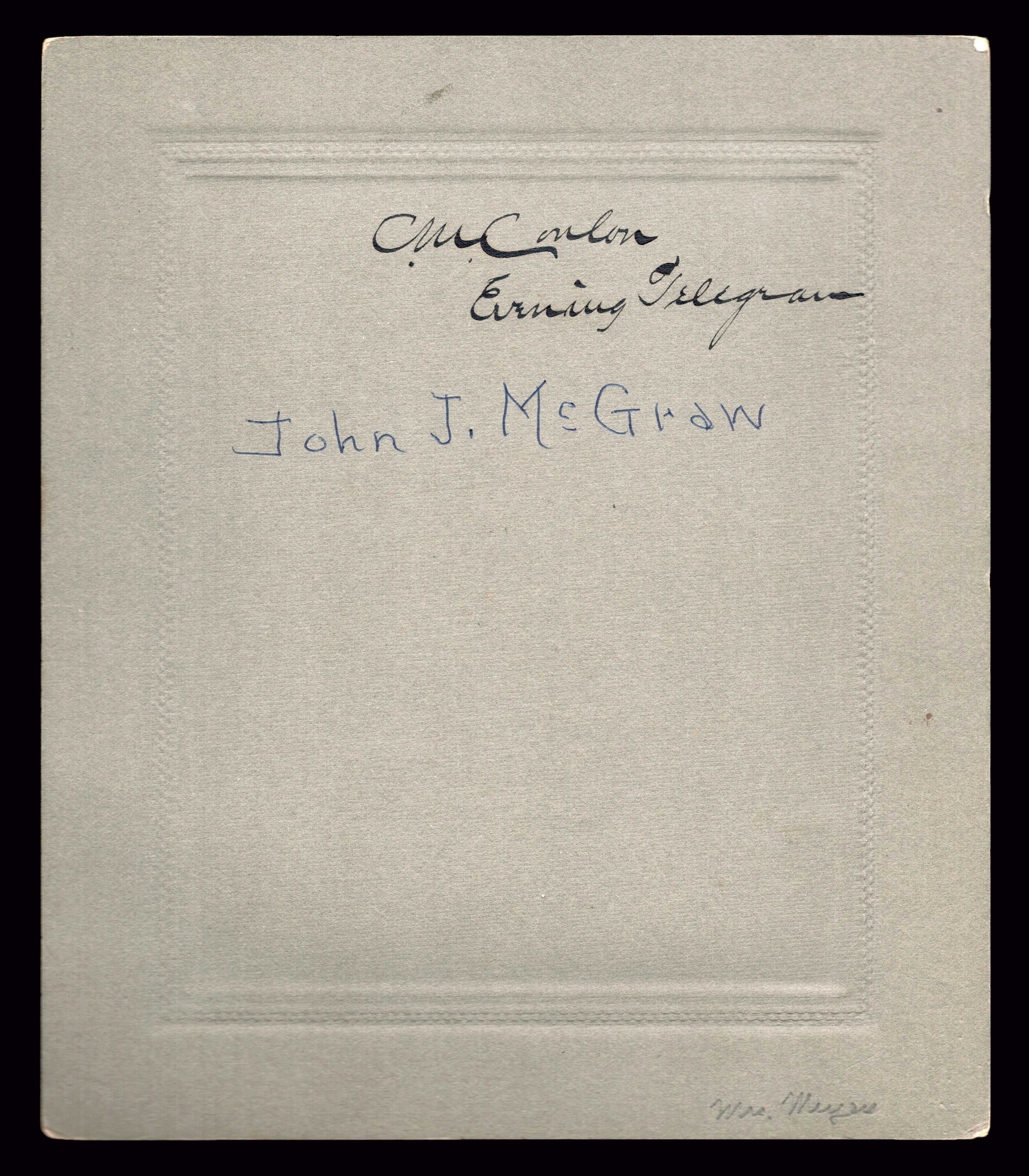 Description:John McGraw photograph by Charles Conlon c.1900-1910. Exceptional 4"x5" sepia tone image picturing McGraw throwing a ball in Giants uniform remaining affixed to its original photographic mount. Hand signed on the verso by Conlon with "Evening Telegram" inscription. "John McGraw" printed on the back in different hand: EX-MT