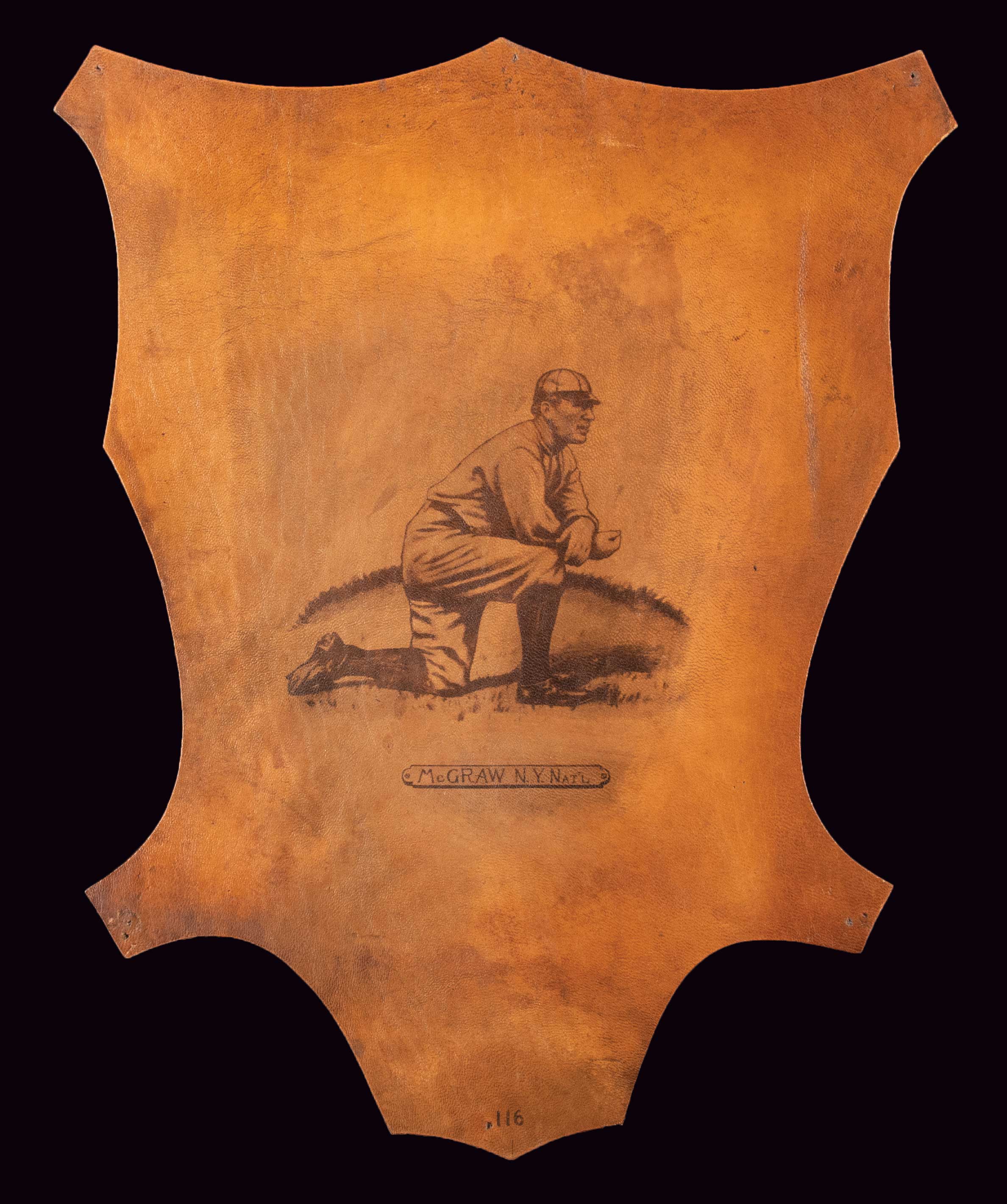 Description:1912 L1 Helmar Leathers #116 John McGraw. Desirable oversized (approx. 10"x14") leather premium issued by Helmar in exchange for coupons packaged with their "Turkish Trophies" line of tobacco products. The coupons could be exchanged for a T3 Cabinet Card (10-15 coupons), S81 Silk (20-25 coupons), or an L1 Leather (35-50 coupons). This trio of premiums are among the most sought after tobacco related issues in the hobby and the L1 Leathers are by far the rarest. Image of McGraw remains well defined having faded only slightly and there is some light to mild toning/discoloration throughout. A vertical indentation/crease on the upper right is more prominent when viewing from the back and there are pinholes in several places on the edges: FR