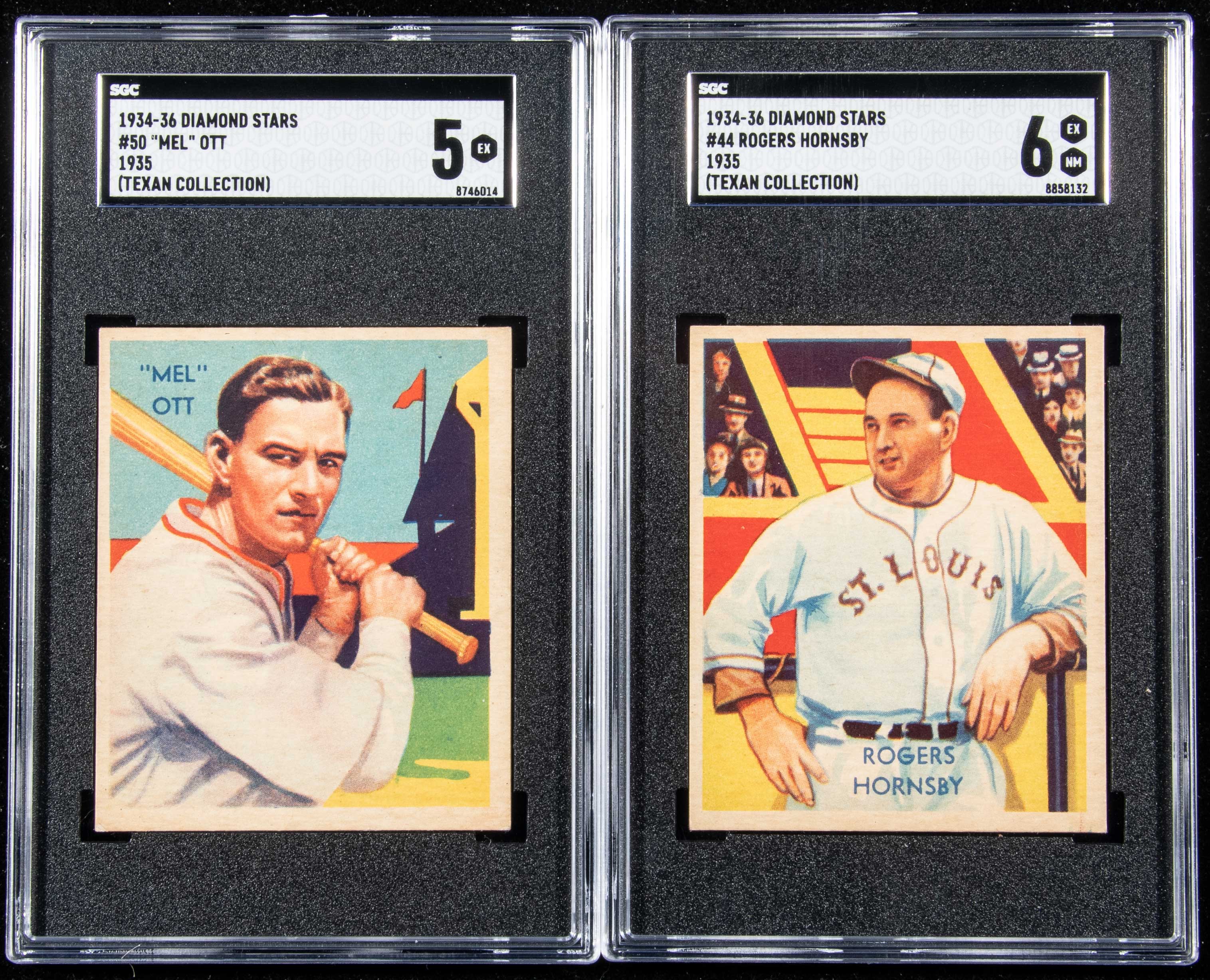 1935 Diamond Stars #44 Rogers Hornsby and 50 Mel Ott (2). Includes Hall of Famers #44 Hornsby (SGC 6 EX NM) and 50 Ott (SGC 5 EX): SGC 5 EX and 6 EX NM