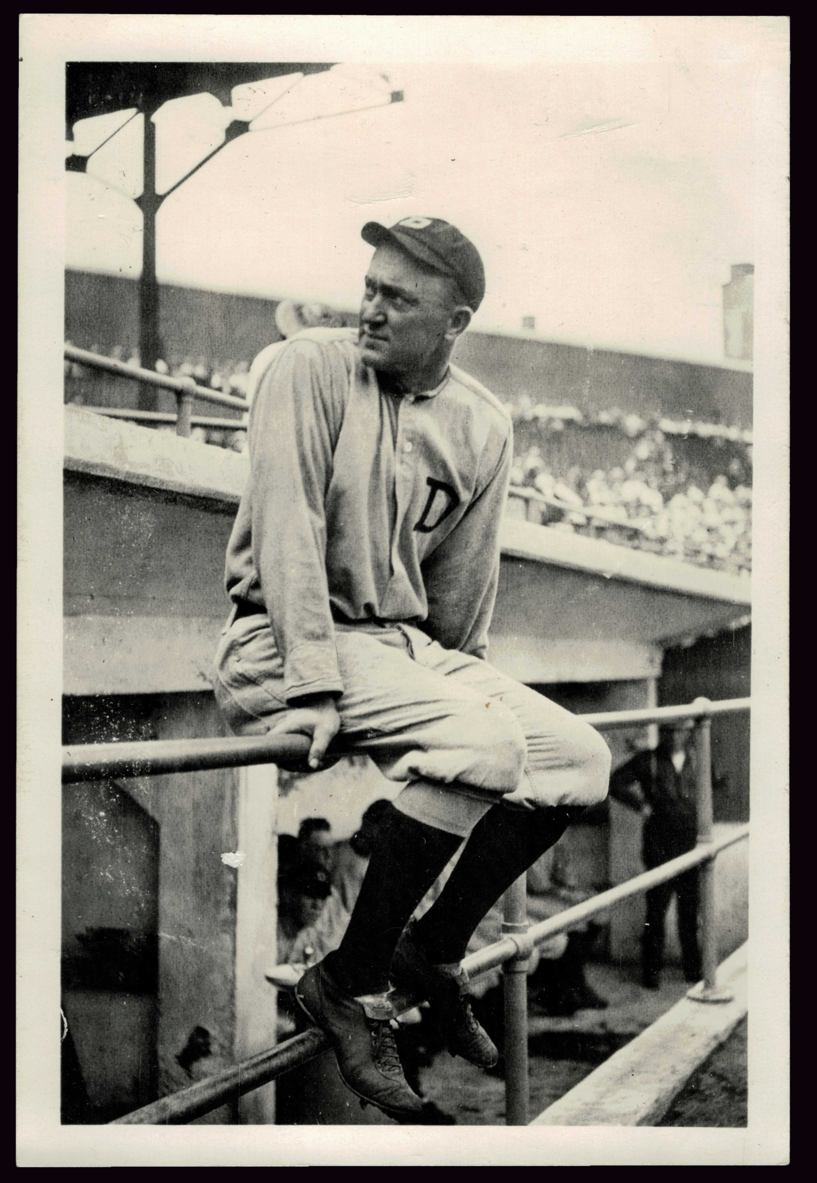 Ty Cobb photograph c.1916. Black and white 4 1/2"x6 1/2" image picturing Cobb in uniform seated on railing. Handwritten identification and 1916 dating on verso: EX-MT