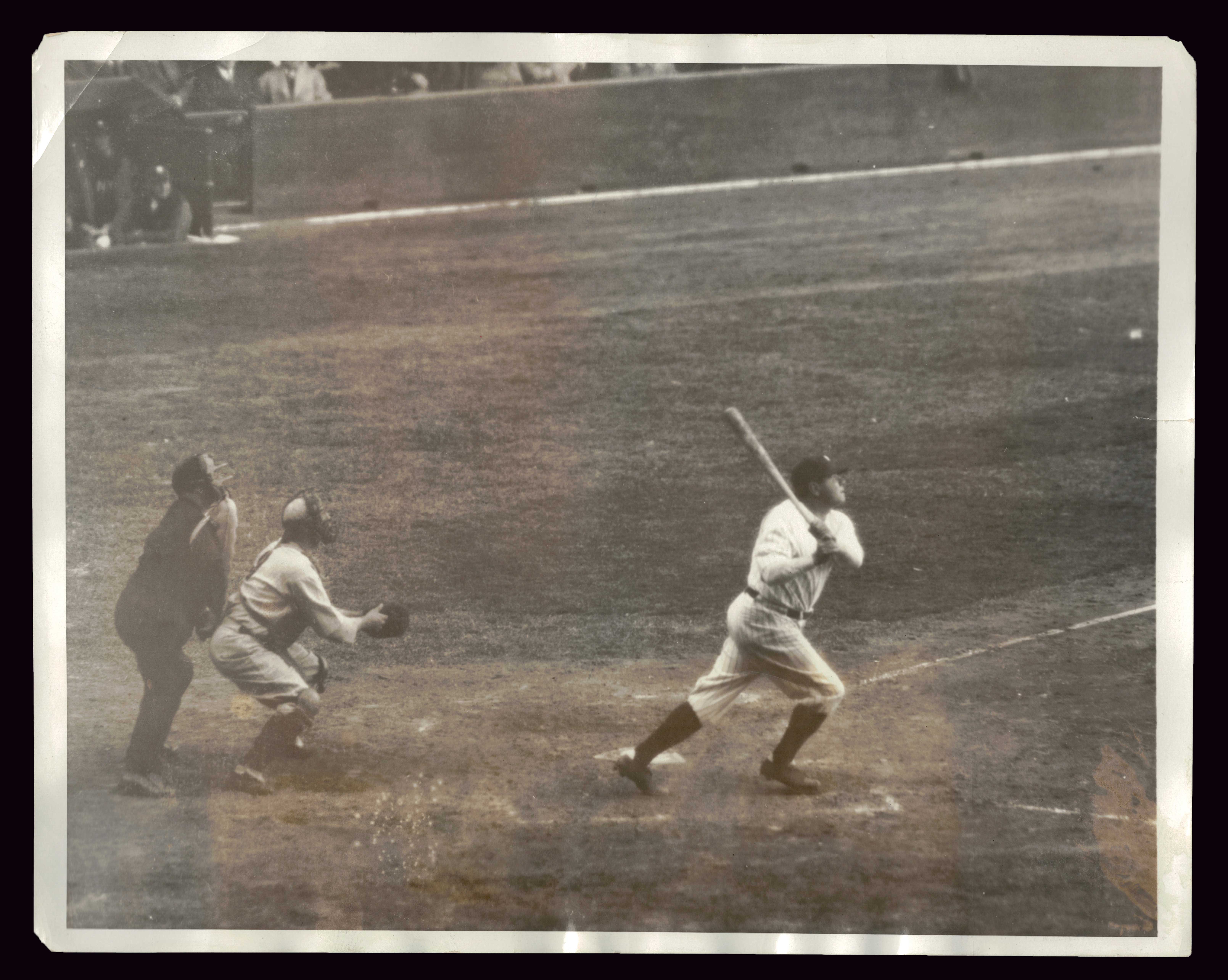 Description:1931 Babe Ruth photograph. Sepia tone 8"x10" image picturing Ruth hitting home run during the opening game of the 1931 season against the Red Sox on April 14th. Some areas of tone difference to the front with typical surface wrinkling to some areas and few small edge tears: VG