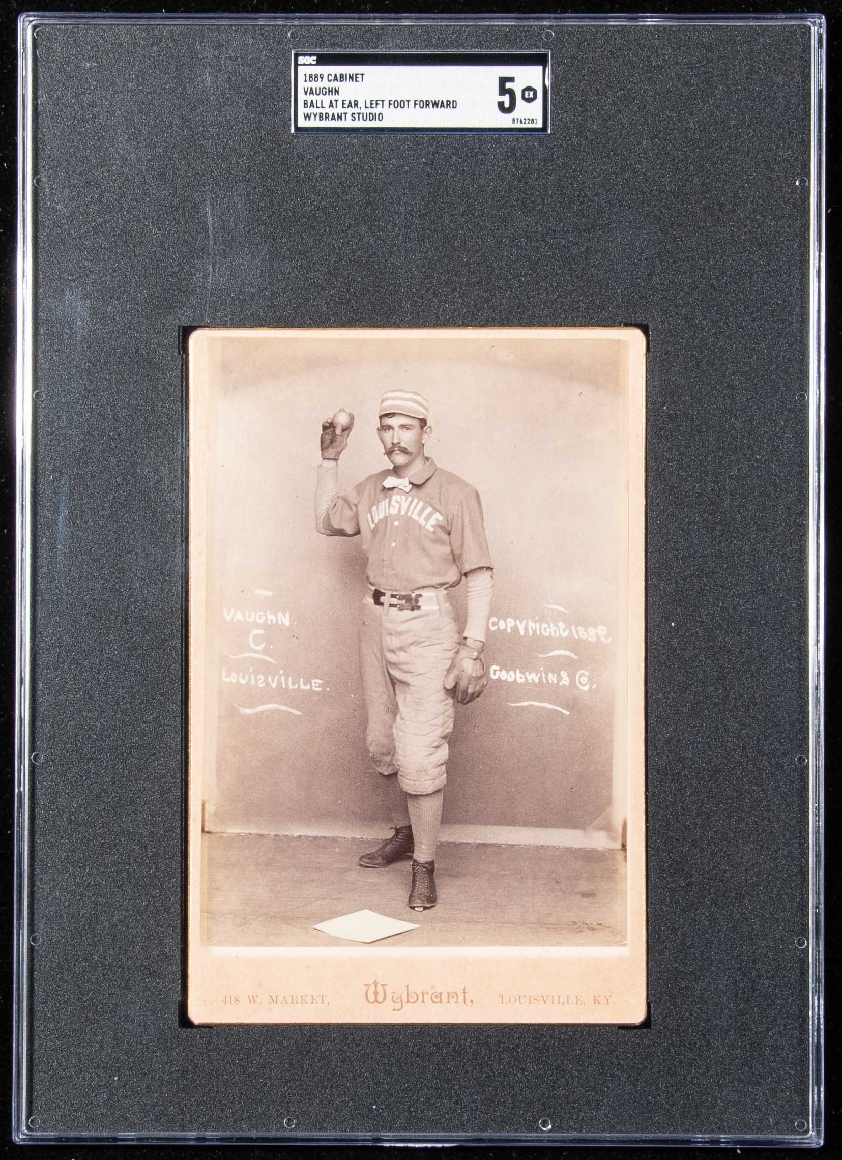 Description:Wybrant Studio Harry "Farmer" Vaughn cabinet photograph c.1889 (Ball at ear, Left foot forward). Rare sepia toned photograph on original mount remaining in very fine overall condition with just the slightest hint of wear/toning. "Wybrant" is noted on the mount and there are imbedded "Copyright 1889" and "Goodwin & Co." marks in the image. The image was taken in the Louisville studio of Wybrant for use by Goodwin and this same pose can be found in their N172 Old Judge series. Offered for the first time having been in the Vaughn Family since the time of issue: SGC 4 VG EX