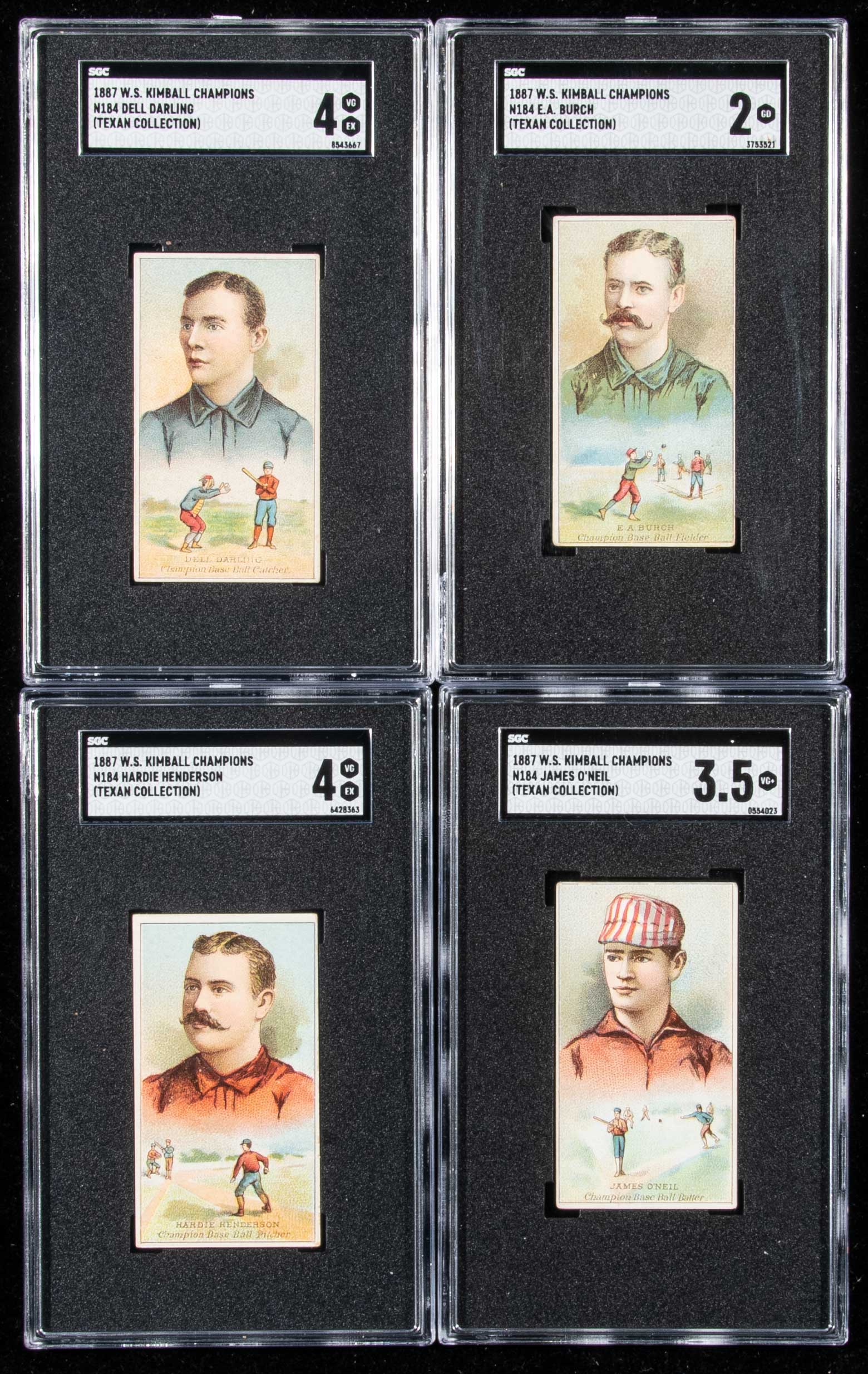 Description:1887 N184 Kimball Champions lot of (4) baseball subjects. Total of (4) cards which comprise all baseball subjects that appear in the series including E.A. Burch (SGC 2 GD); Dell Darling (SGC 4 VG EX, ink mark on back); Hardie Henderson (SGC 4 VG EX); and James O'Neil (SGC 3.5 VG+): SGC 2 GD to SGC 4 VG EX