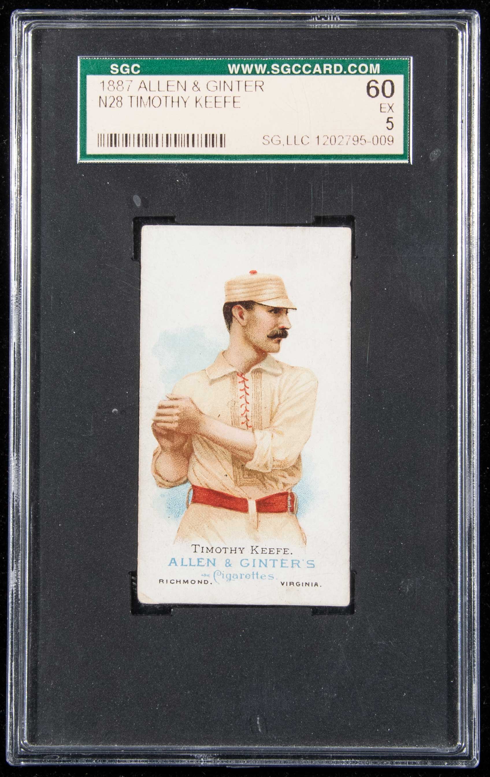 Description:1887 N28 Allen & Ginter Tim Keefe. Important early tobacco card showing the noted Hall of Famer in crisp and well defined color. Mild scattered would likely result in a slightly lower technical grade by todays' standards and includes some minor corner and edge wear: SGC 60 EX