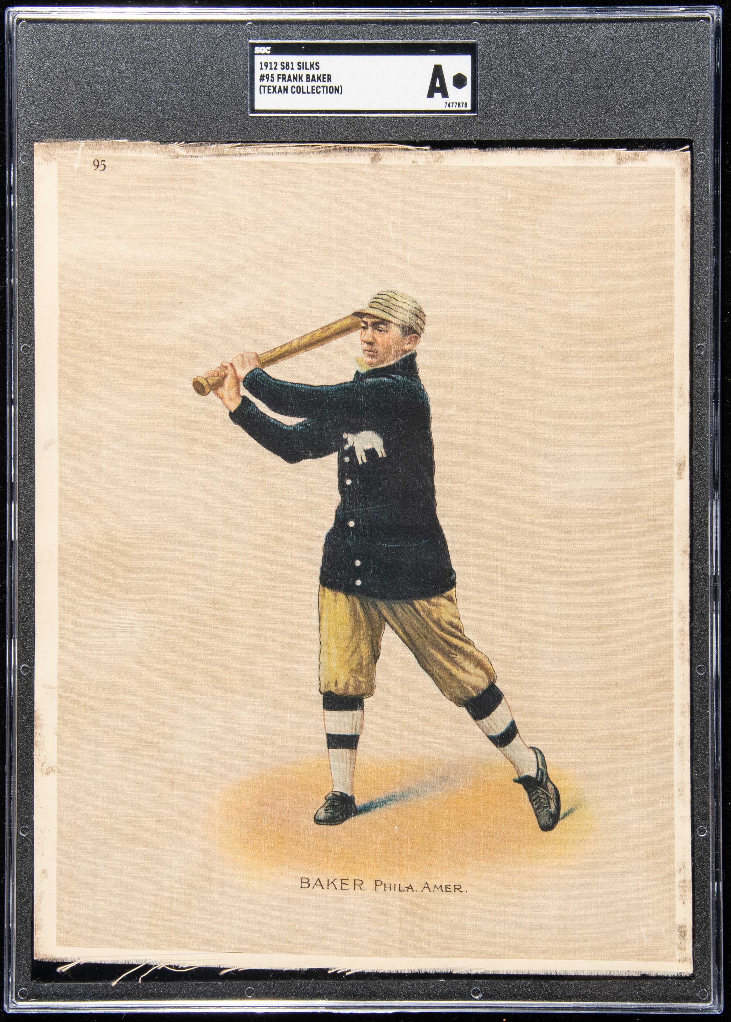 1912 S81 Large Silk Premium #95 Frank Baker. Early Hall of Fame slugger likeness offers bright and robust color. Mild toning throughout with some more pronounced scattered spots/stains: SGC "A"