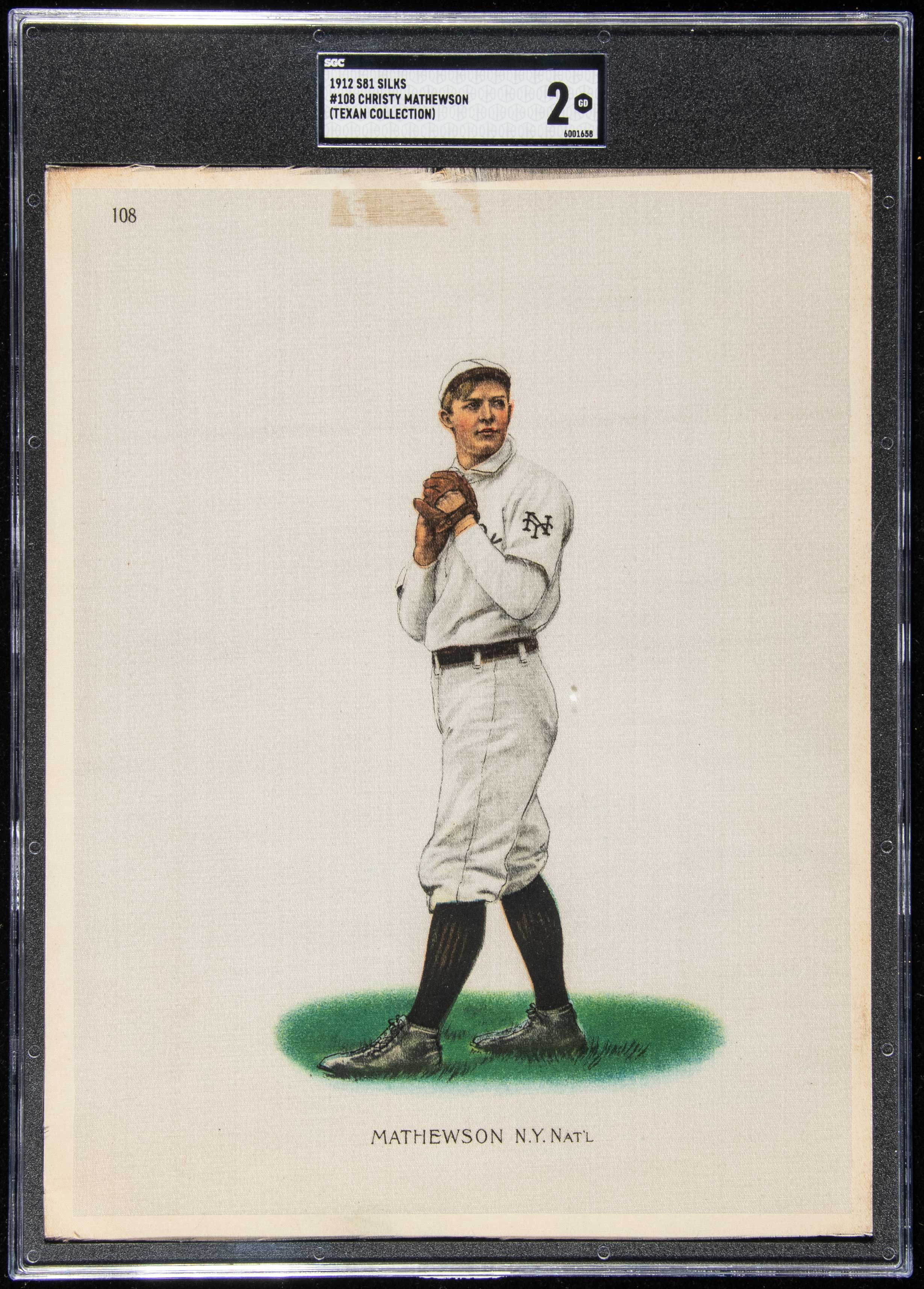 1912 S81 Large Silk Premium #109 Christy Mathewson. Very strong overall appearance with little wear aside from a small tape stain along the top edge: SGC 2 GD