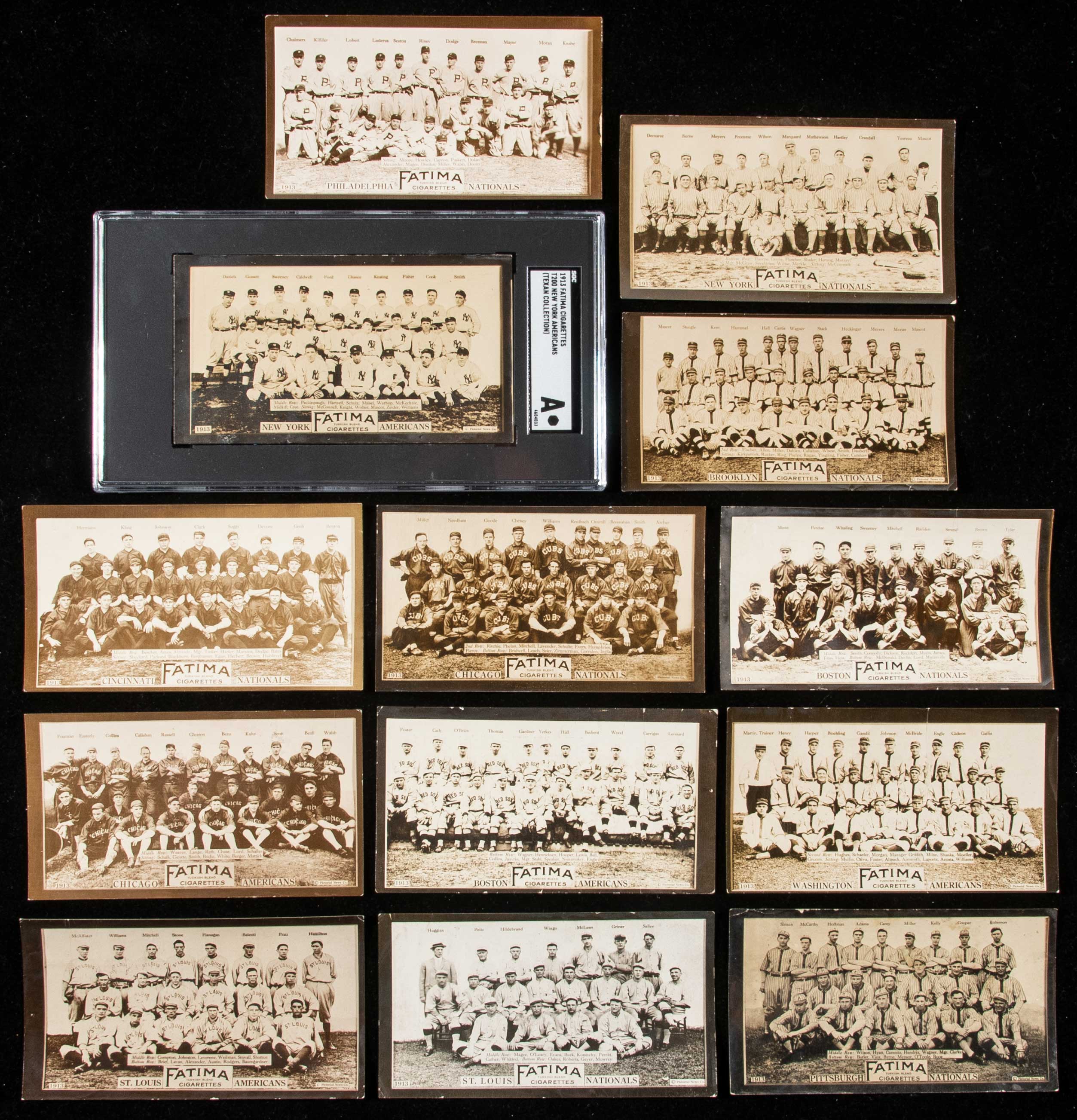 Description:1913 T200 Fatima Team Cards near complete set (13 of 16 cards). Desirable early photographic premiums, seldom offered in this quantity. Includes Boston Americans (GD, small erased mark on back), Chicago Americans (VG appearance, likely trimmed), New York Americans (SGC "A"), St. Louis Americans (GD-GD/VG), Washington Americans (GD), Boston Nationals (VG), Brooklyn Nationals (GD/VG appearance, likely trimmed), Chicago Nationals (VG/EX-EX appearance, trimmed), Cincinnati Nationals (GD), New York Nationals (GD/VG-VG), Philadelphia Nationals (VG-VG/EX), Pittsburgh Nationals (FR/GD, likely trimmed), and St. Louis Nationals (VG): see description