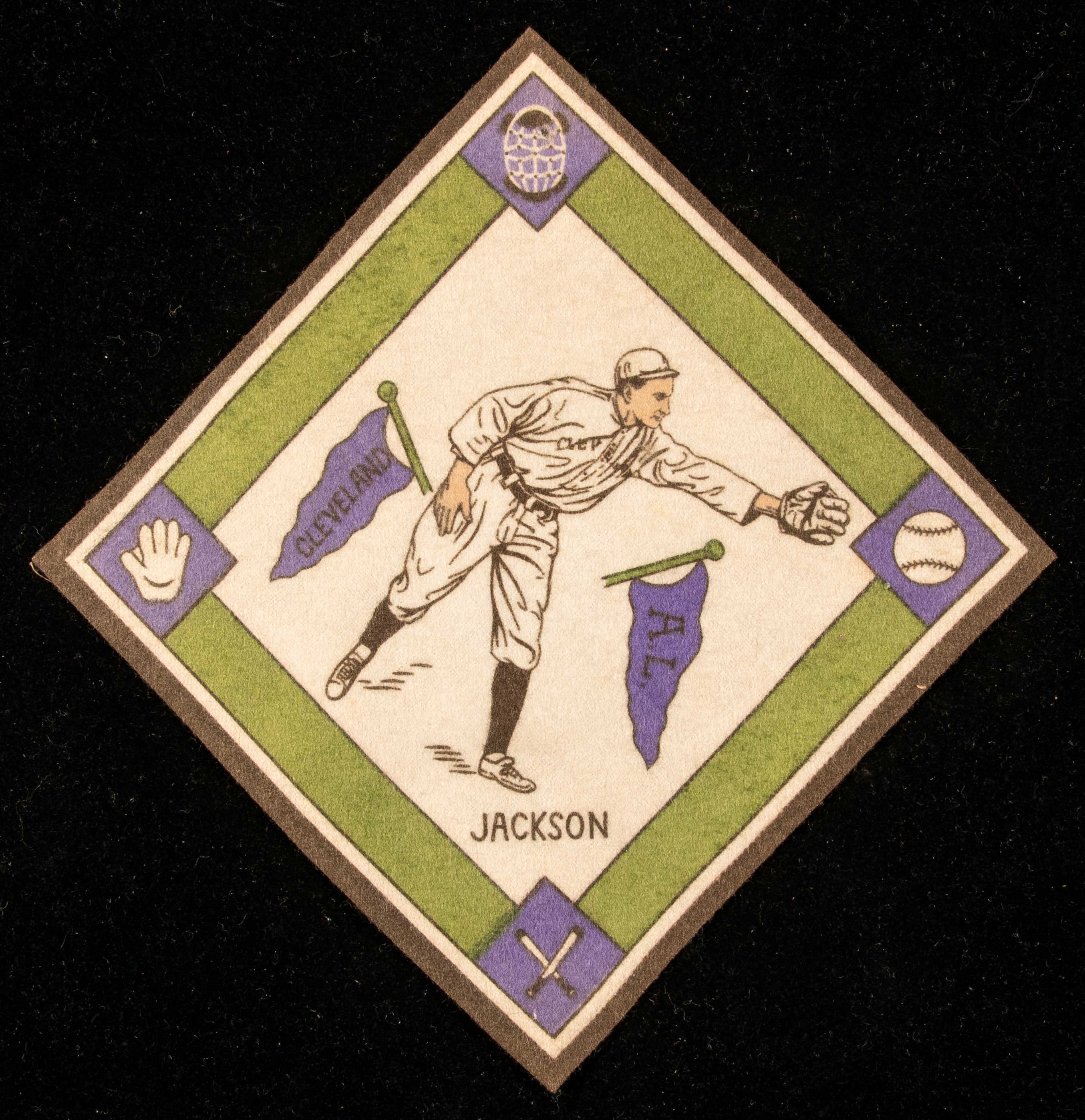 Description:1914 B18 Blankets Joe Jackson (purple pennants) (ex-Copeland Collection). High grade appearance with no mentionable wear however there is a mounting hole (slightly larger than pinhole) situated within the catcher's mask above Jackson's head. Uncommonly well centered for the issue: EX