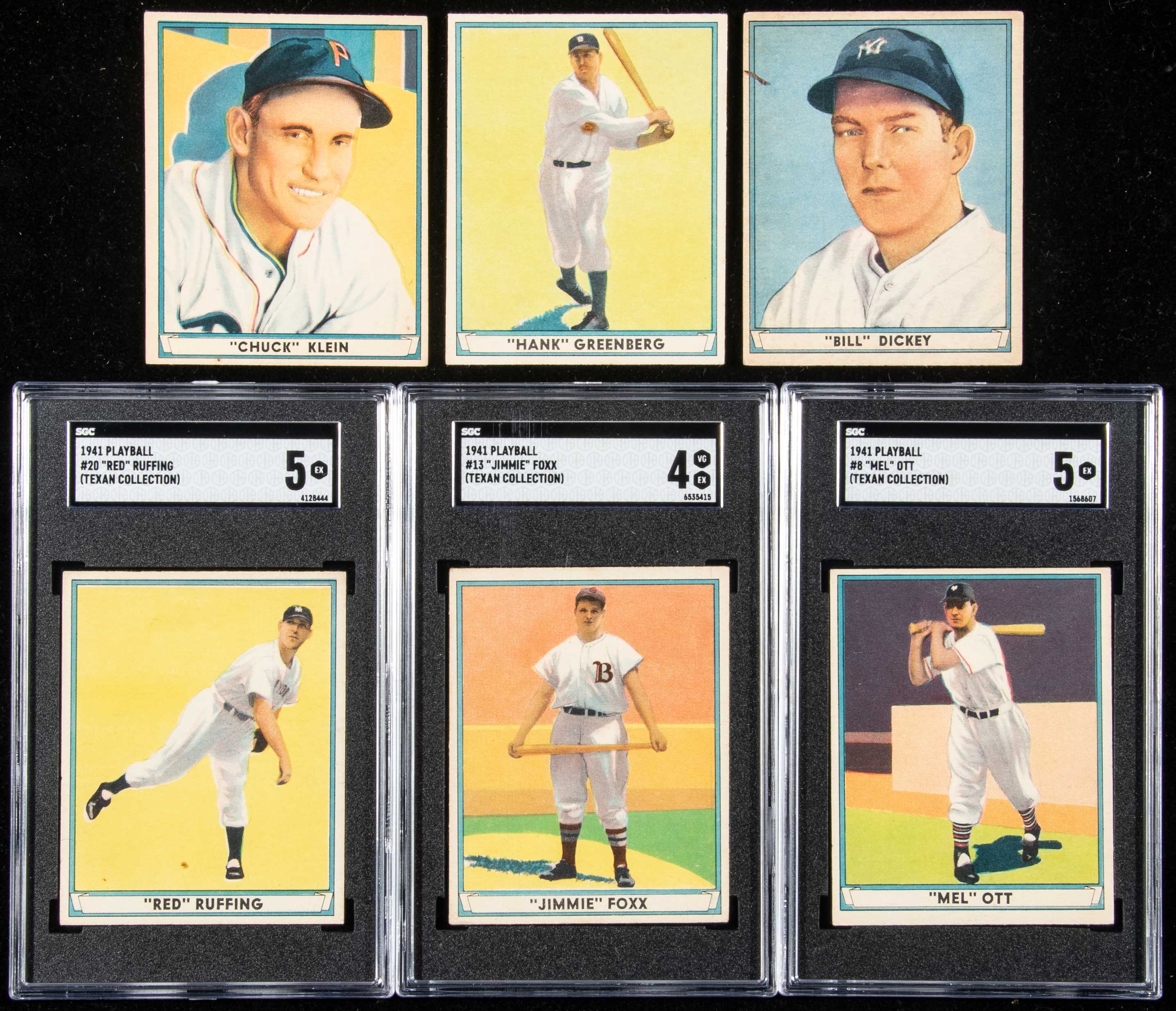 1941 Play Ball near complete set (68 of 72 cards). Keys: #1 Miller (SGC 5 EX), 6 Hubbell (SGC 4.5 VG EX+), 8 Ott (SGC 5 EX), 10 Vaughan (NM OC), 13 Foxx (SGC 4 VG EX), 15 Cronin (VG/EX), 18 Greenberg (nice EX-EX/MT corners and well centered, small indentation at center), 20 Ruffing (SGC 5 EX), 60 Klein (VG), 61 DiMaggio (VG), 63 DiMaggio (VG), 64 Doerr (VG/EX, diamond cut), 70 Dickey (VG), and 72 Gomez (GD/VG). Missing #14 Williams, 19 Gehringer, 54 Reese, and 71 DiMaggio: Avg. VG/EX with some nicer