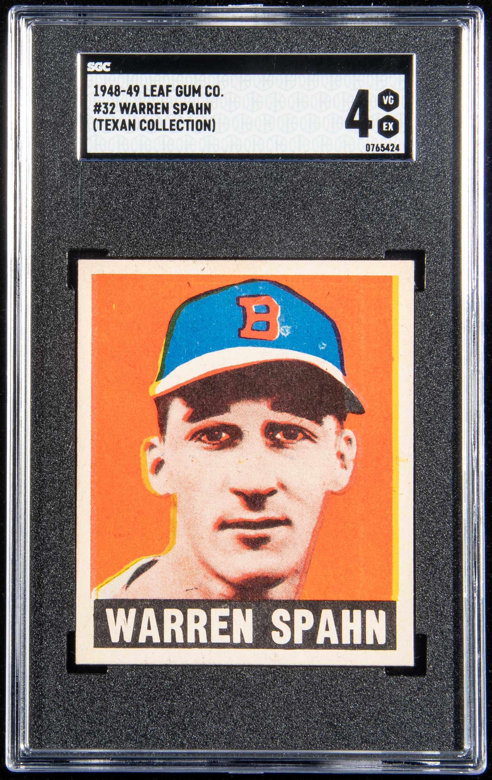 1948 Leaf #32 Warren Spahn. Well centered with little to no mentionable wear. SGC has likely downgraded the card due to registration being a touch off: SGC 4 VG EX