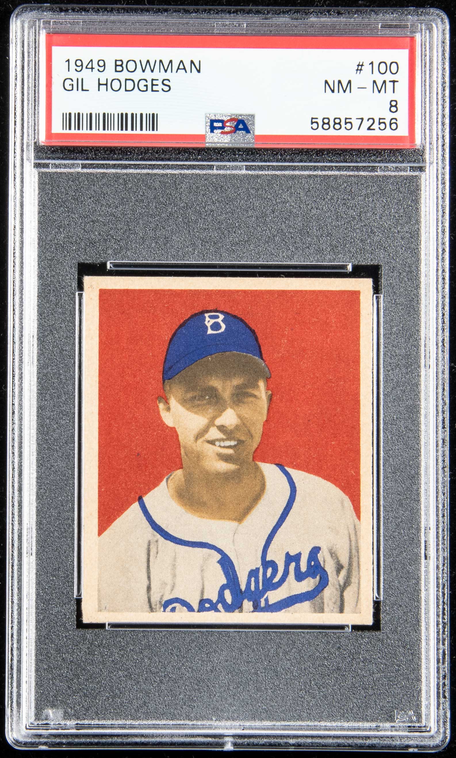 1949 Bowman #100 Gil Hodges. Well centered with no mentionable wear: PSA NM-MT 8