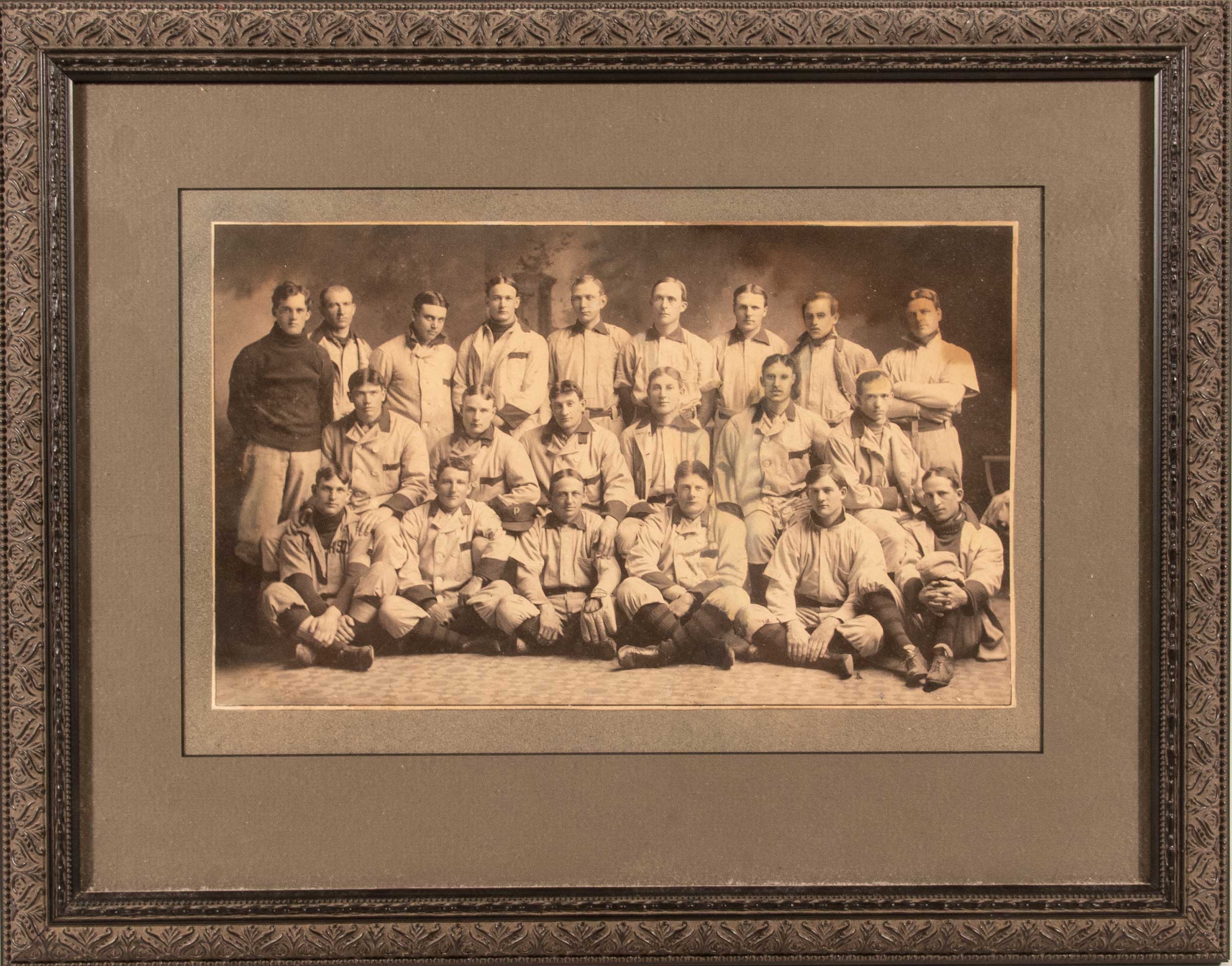 Description:Fine 1904 Pittsburgh Pirates team photograph. Sepia toned large format photo showing uniformed team members in studio setting with notables including Honus Wagner, Deacon Phillippe, Ginger Beaumont, Tommy Leach, Kitty Bransfield, and Fred Clarke. Framed to 16"x20" with image size approx. 8"x13" on what appears to be the original mount with "Eckler, Hot Springs, Ark." marked at lower right. Displays well with some mild scattered toning and light wear. Areas have had inpainting to reverse damage: see description