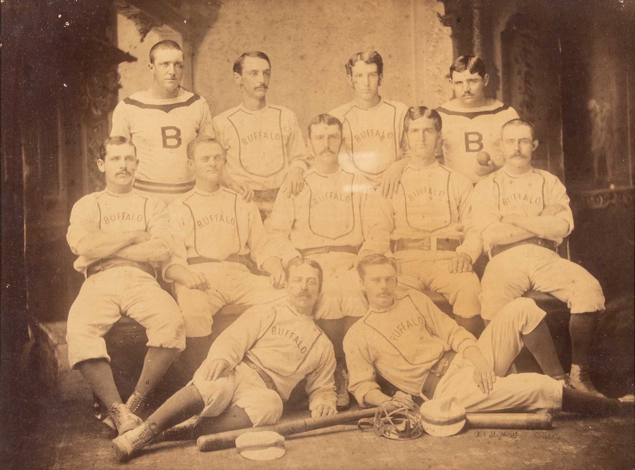 Description:Buffalo Bisons team photograph with Pud Galvin c.1878 Rare imperial size cabinet photograph showing uniformed members of the International Association Championship team in studio setting. Hall of Famer Pud Galvin is at the right end of the top row holding a baseball. Others are tentatively identified as Tom Dolan, Jack Allen, Bill McGunnigle, Bill Crowley, Dave Eggler, Steve Libby, Chick Fulmer, Denny Mack, Davey Force, and Trick McSorely. Substantive baseball photography dating to this seminal period in the games' history is exceedingly rare and the offered example ranks among the very best pieces to have surfaced with regard to both image quality and inclusion of so noted a figure as Galvin. Housed in 18.5"x22" period frame with little mentionable wear visible to image and some mild toning/discoloration to the edges of the mount/mat: EX
