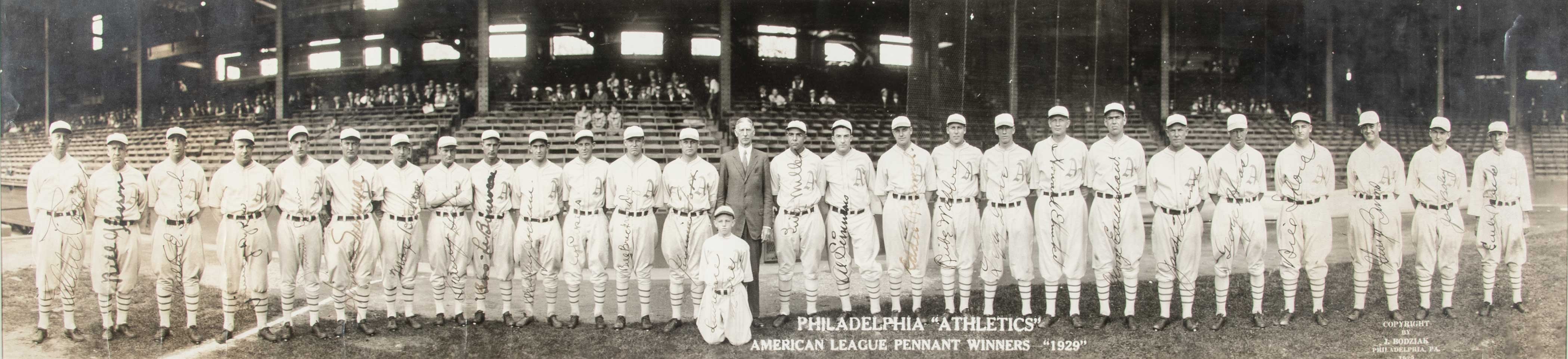 Description:1929 Philadelphia Athletics team autographed panoramic photograph. Large format sepia toned photograph showing team members standing shoulder to shoulder in Shibe Park. Signed by (27) across their respective likeness incl. Jimmie Foxx, Eddie Collins, Al Simmons, Lefty Grove, George Earnshaw, Howard Ehmke, Ed Rommell, Bing Miller, Mickey Cochrane, and others. Kid Gleason is clubhouse. All are done in period fountain pen rating 7 to 8 out of 10. Framed to 12"x35" with minor wear including some wrinkles/waviness throughout. Includes auction LOA from JSA: Sigs. EX/MT-NM, Photo VG