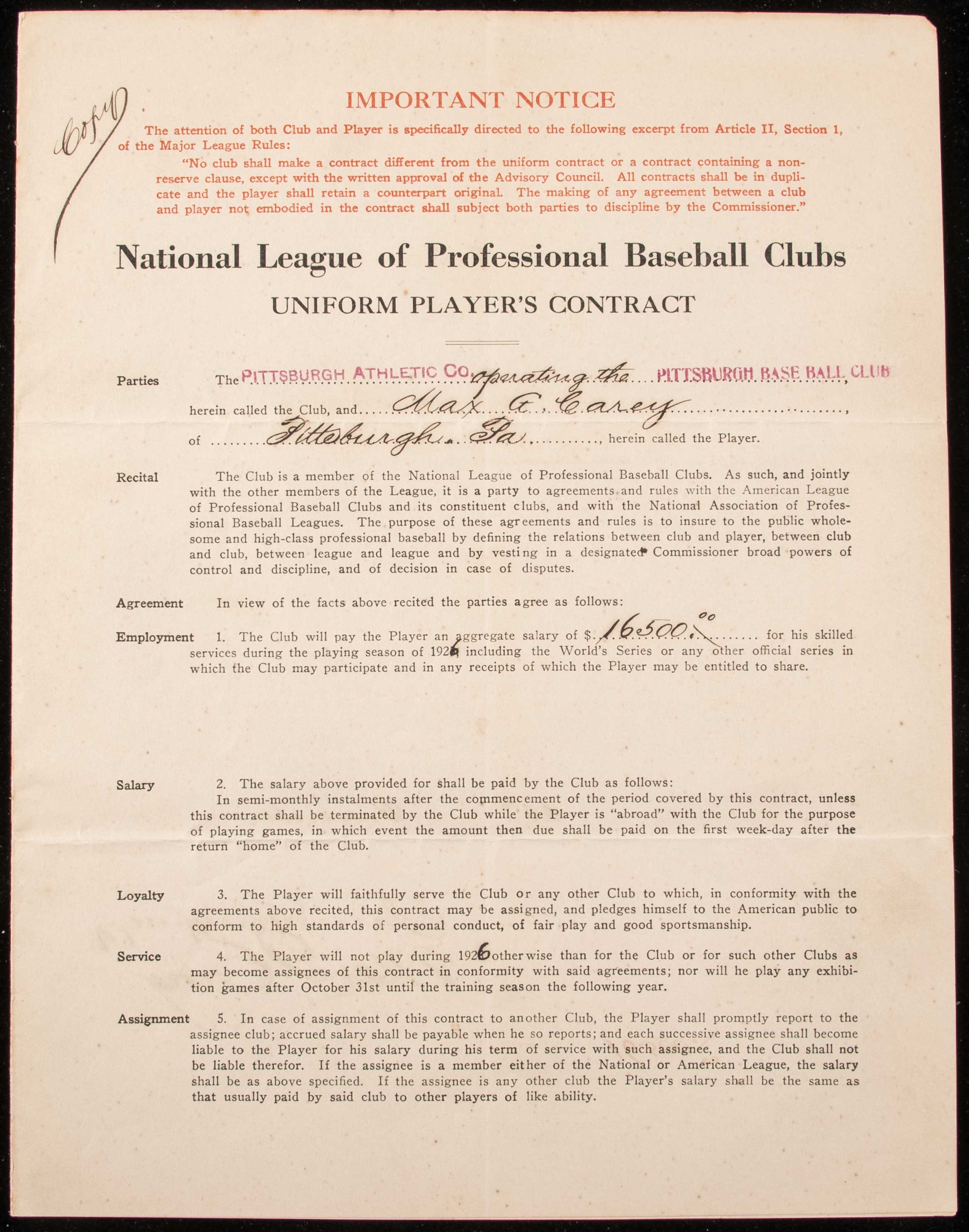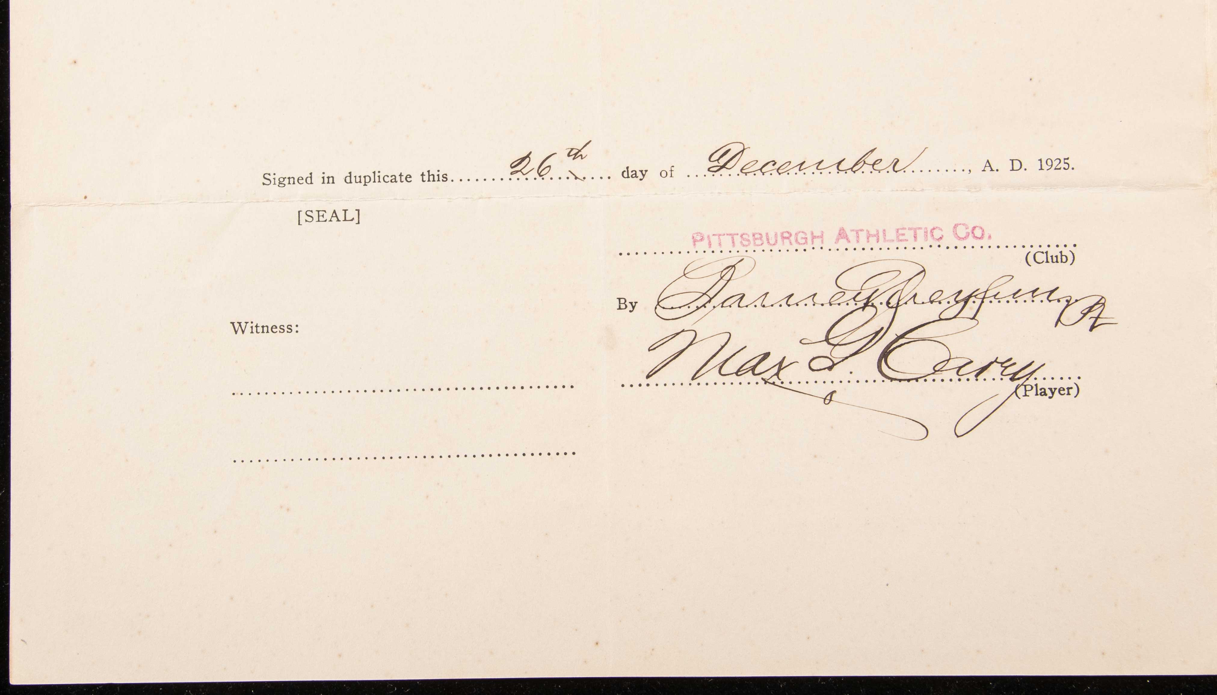 Description:1925 Max Carey and Barney Dreyfuss autographed Pittsburgh Pirates contract (World Series Championship season). Uniform Player's contract as executed between Carey and the Pirates for his services during the 1925 season. Signed by Carey ("Max G. Carey") and team President Barney Dreyfuss in fountain pen rating 8 to 9 out of 10. This was a file copy (either for Carey or the team) and is so noted in (2) areas. Mild toning and light wear with two more pronounced strips on the back. Includes auction LOA from JSA: Sigs. NM, Contract VG-EX