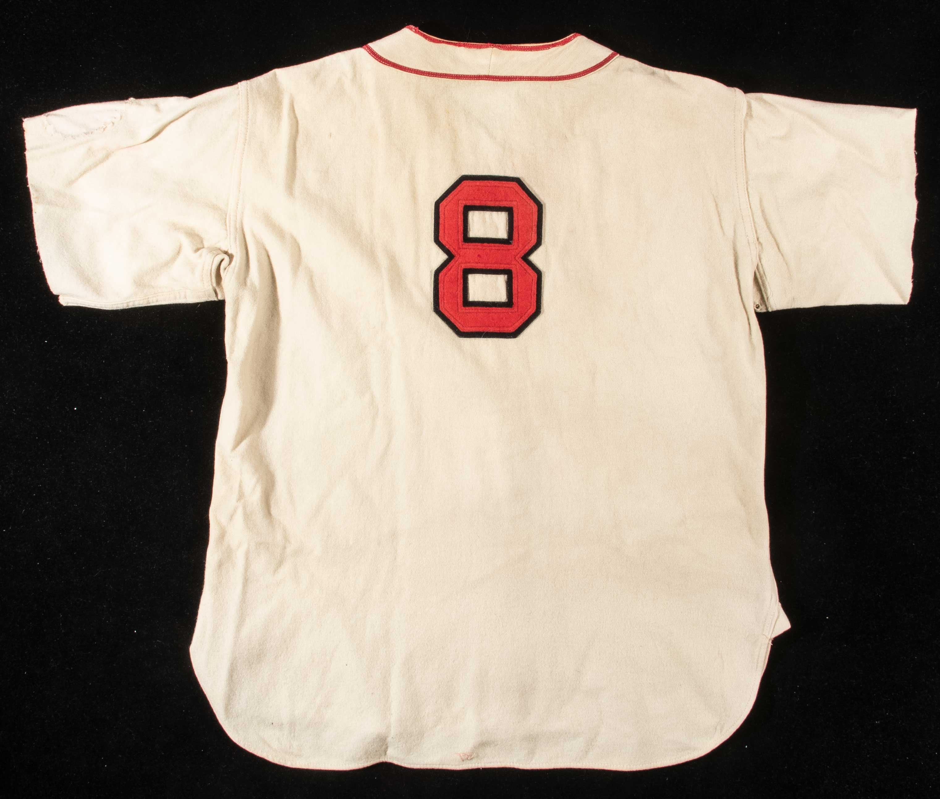 Description:1937 Frank Pytlak Cleveland Indians professional model home jersey. Cream colored flannel jersey has the Indians "C" team logo on left front chest and number "8" on the back. In the collar is a Spalding manufacturers tag beside the embroidered name "Pytlak." The year "37" is embroidered is similar style of chain stitch on the inside tail. On the left sleeve is an outline where the team logo patch was removed and both sleeves have been shortened. An included 8"x10" sepia toned team photo of the 1938 Indians shows Pytlak seated in the front row with his sleeves trimmed in similar fashion. Use and wash wear are evident throughout along with some age/storage related wear. A notably rare style and one of only a handful from this era in circulation. Includes 8"x10" team photo and LOA from Hunt Auctions: EX