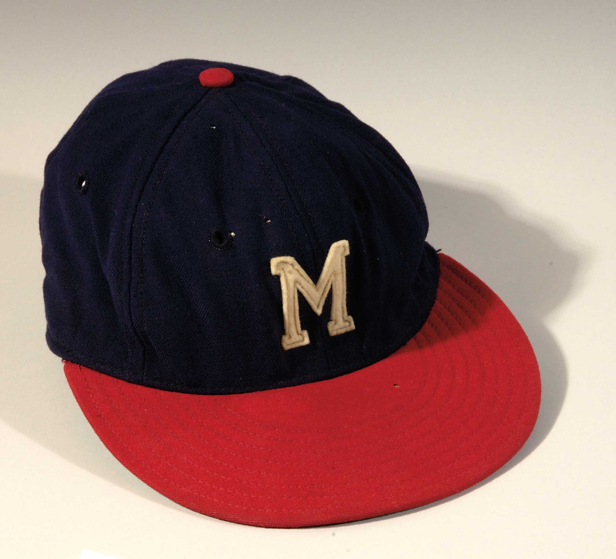 Description:Warren Spahn Milwaukee Braves professional model hat c.1954-56 Early style variant having applied felt "M" on front with navy blue top and red bill. Interior leather band retains its original Horace Partridge Co. label which was the previous manufacturer of the Braves equipment when playing in Boston. Evident use throughout most visibly to the interior leather band. Accompanied by a replica image of Spahn wearing a similar hat with son Greg. Includes LOA from Hunt Auctions: EX
