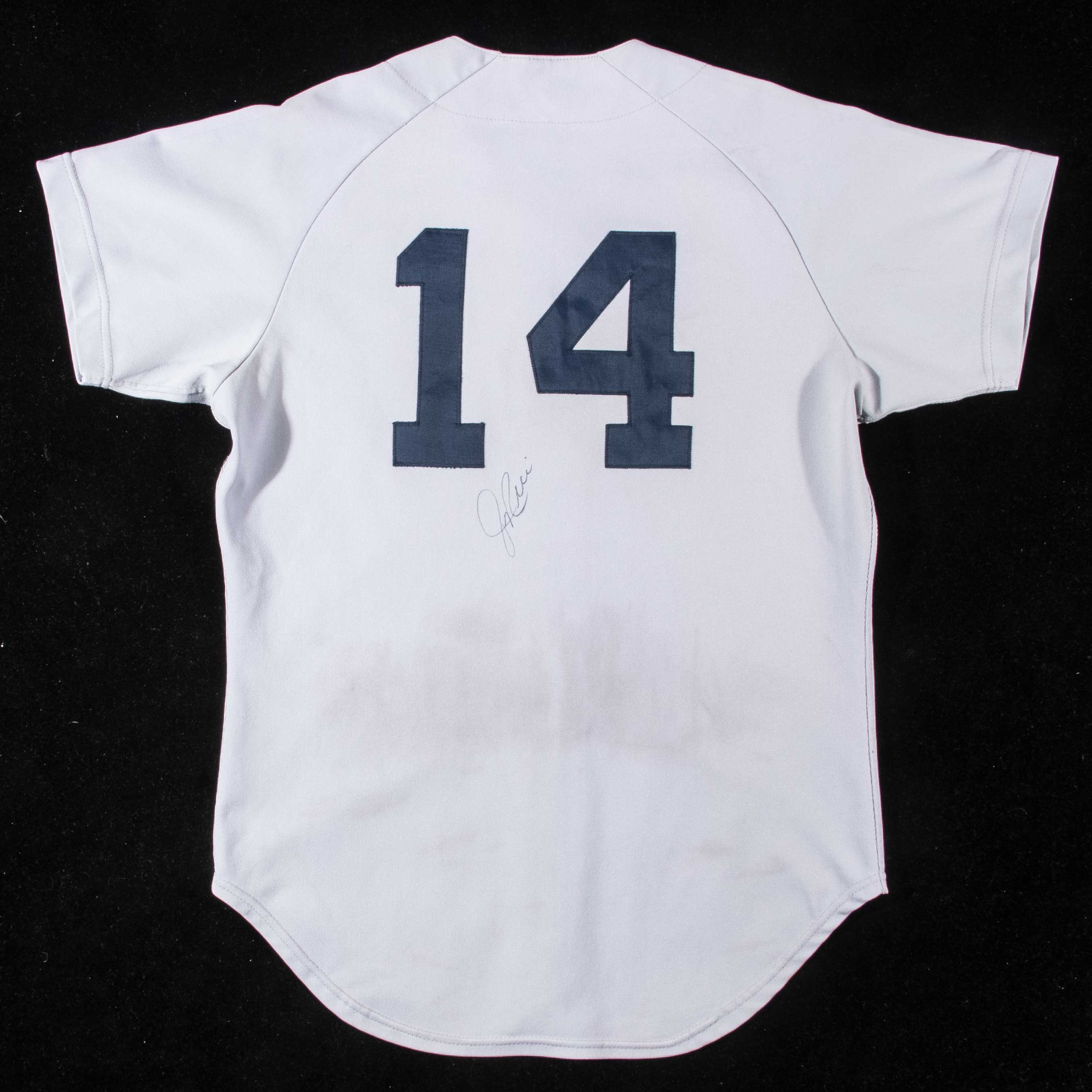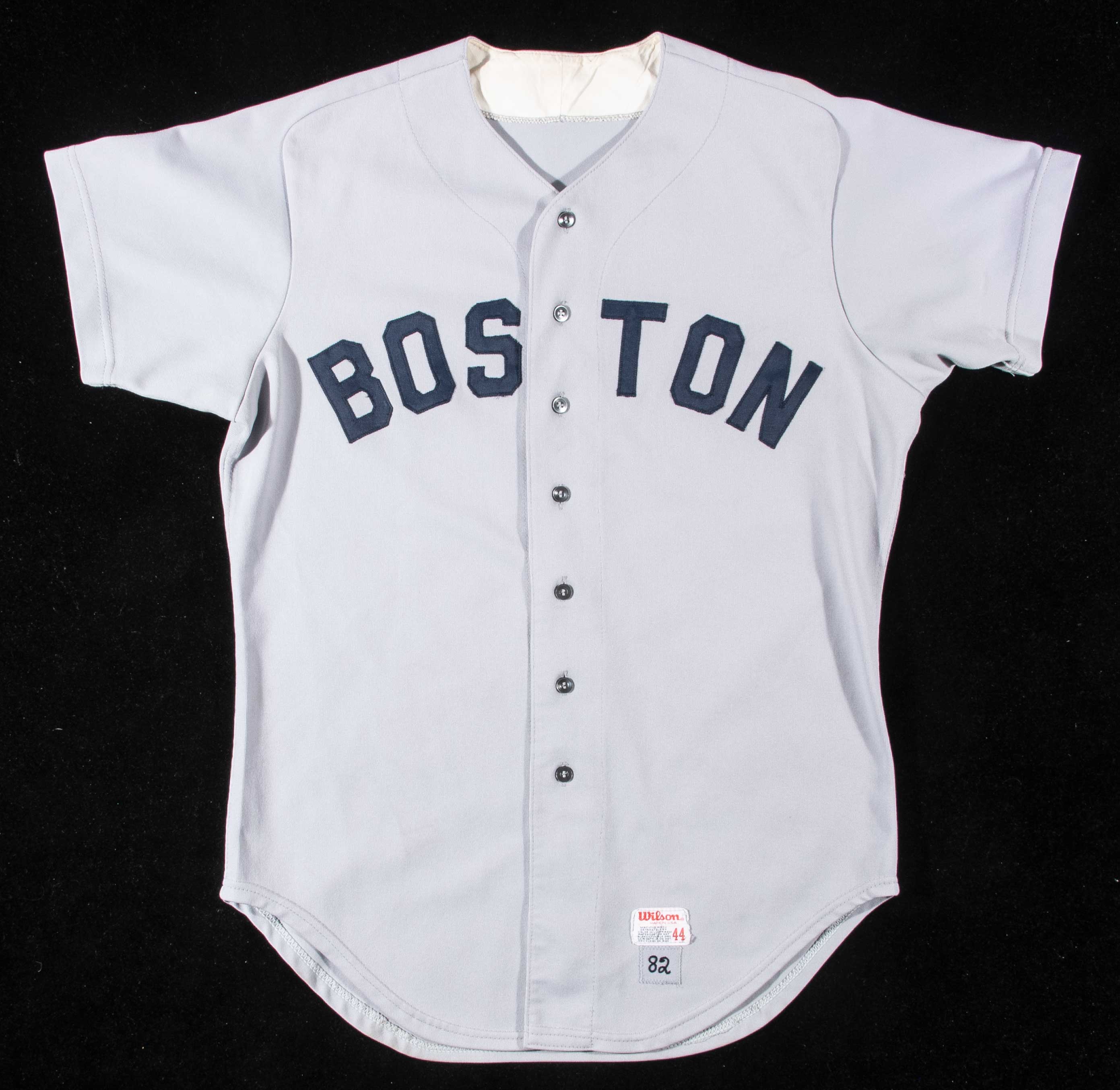 Description:1982 Jim Rice autographed Boston Red Sox professional model road jersey (SGC/Grob: "Superior"). Gray jersey has "Boston" team name across the front and number "14" on back. Wilson tag on the front tail (separated along right edge) notes size (44) and below is an "82" embroidered year tag. Nice use and wash wear are evident throughout and it has been signed on the back in marker rating 8 out of 10. Includes LOA from Hunt Auctions and auction LOA from JSA: EX