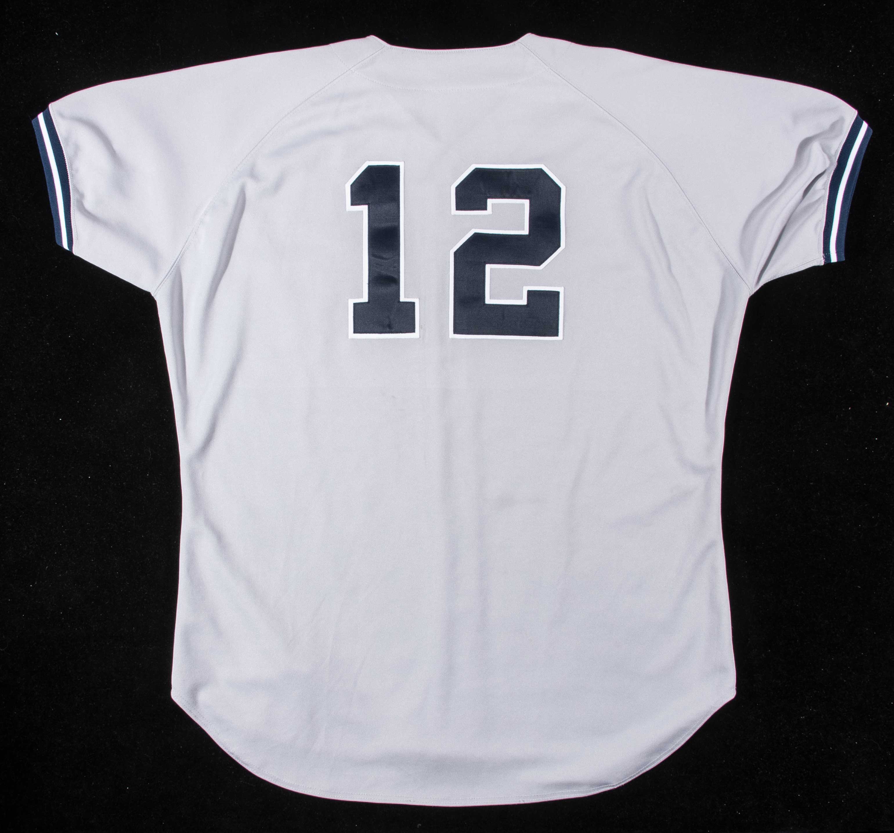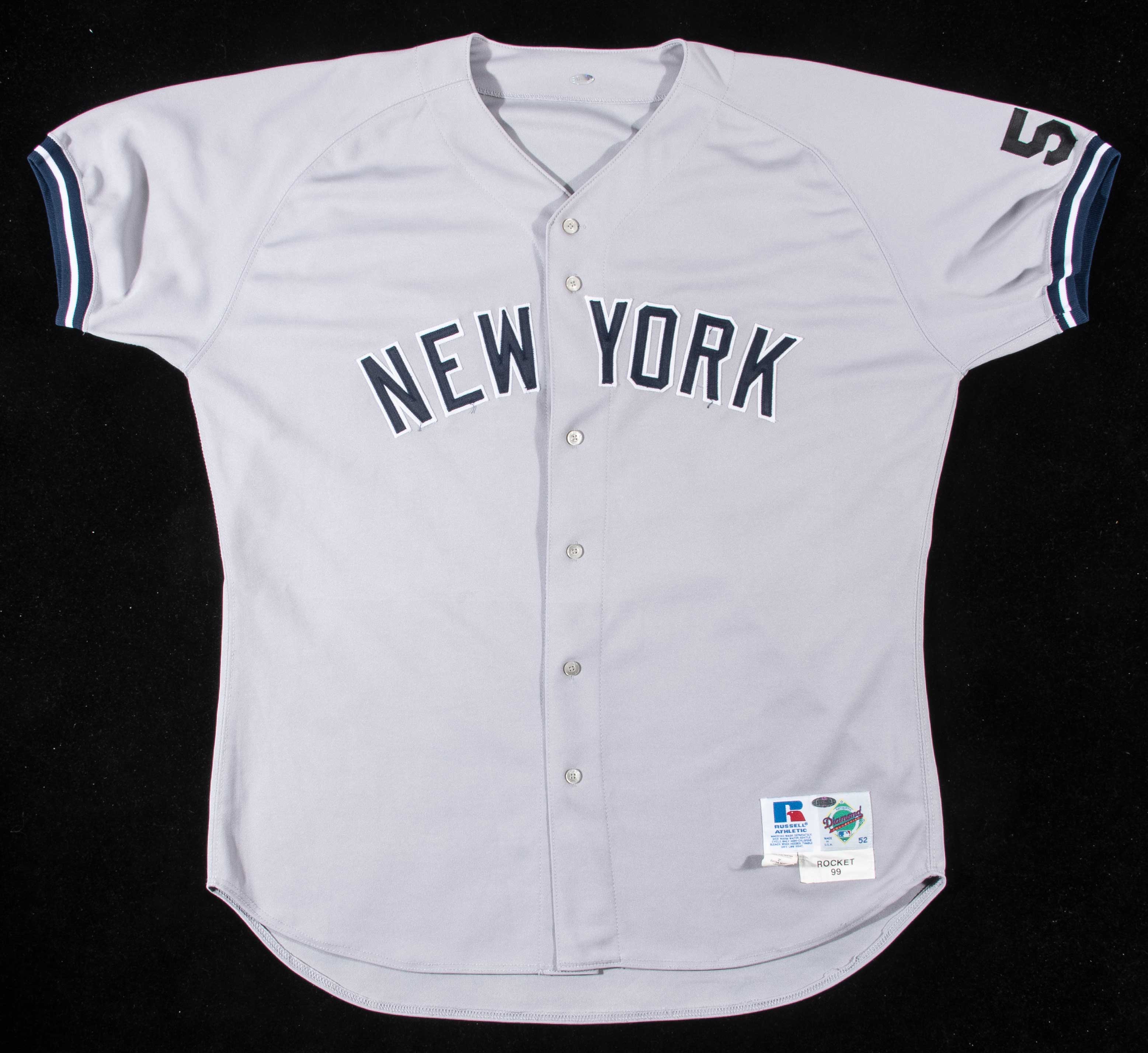 Description:1999 Roger Clemens game used New York Yankees road jersey (Steiner - MEARS A10). Road gray jersey has "New York" team name across the front and number "12" on back. On the left sleeve is a black number "5" worn in honor of Joe DiMaggio. Russell Athletic tag on the front tail notes size (52) and adjacent are "Polyester" and custom length flag tags. A printed strip tag reads "Rocket 99." A Steiner authentication hologram is affixed and the included LOA confirms that the jersey is "game used." Clemens only wore the number (12) for New York for a short time after joining the team before his more customary number (22) became available. Includes LOAs from Steiner, MEARS (graded "A10), and Hunt Auctions: EX